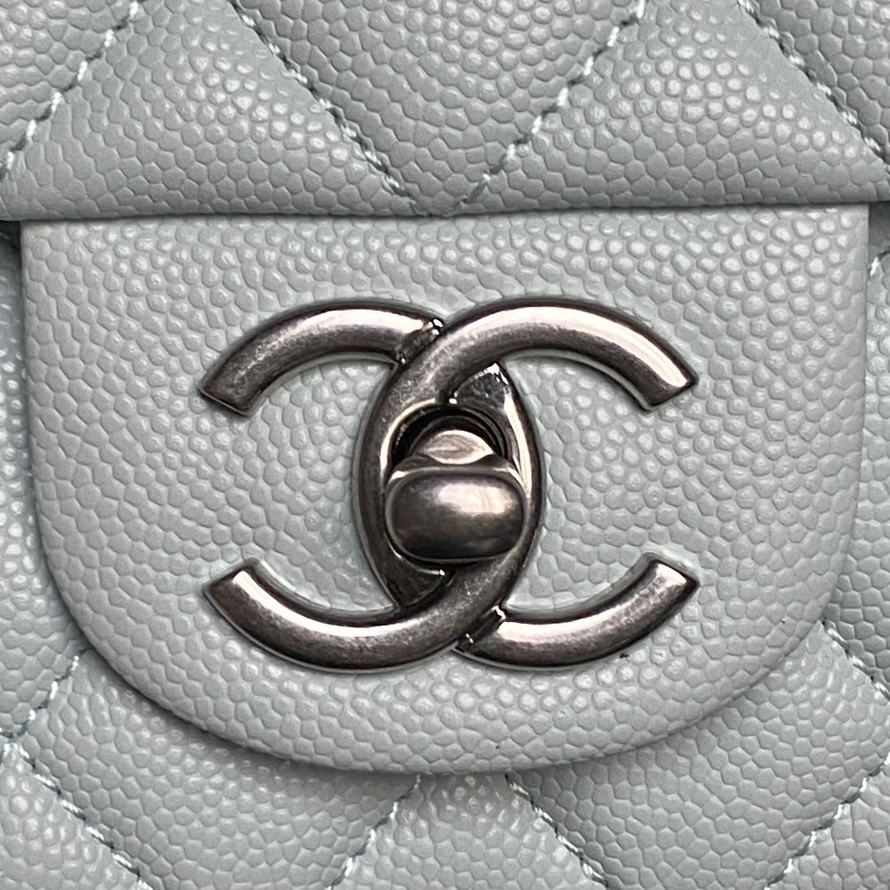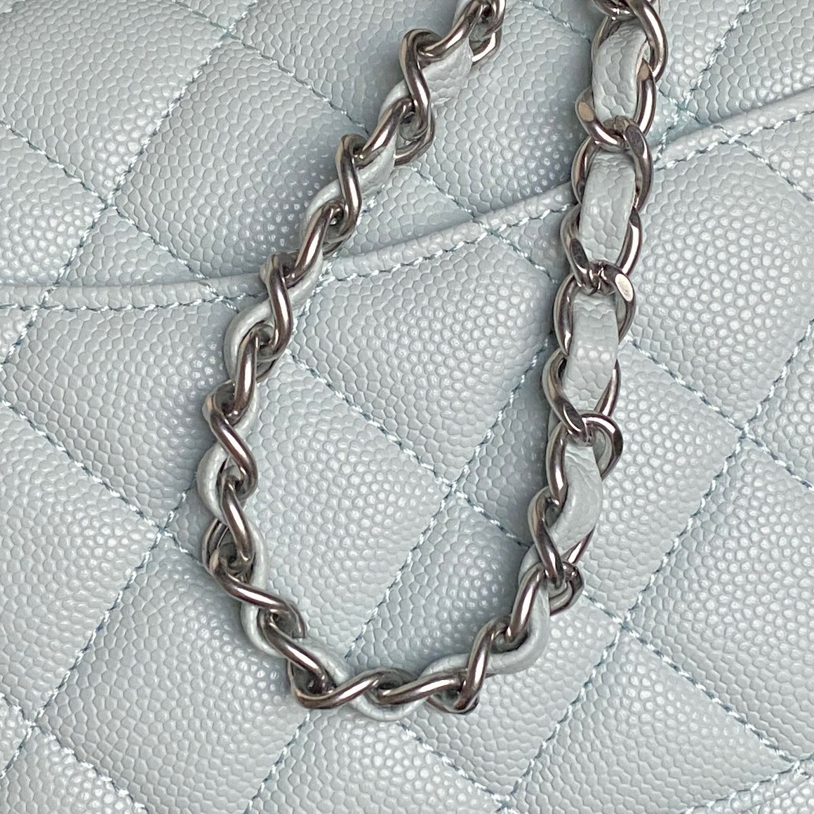 The light blue color is so refreshing! It's a great addition to my Chanel collection. The bag is well-made and the silver-tone hardware is beautiful. I get so many compliments when I wear it.