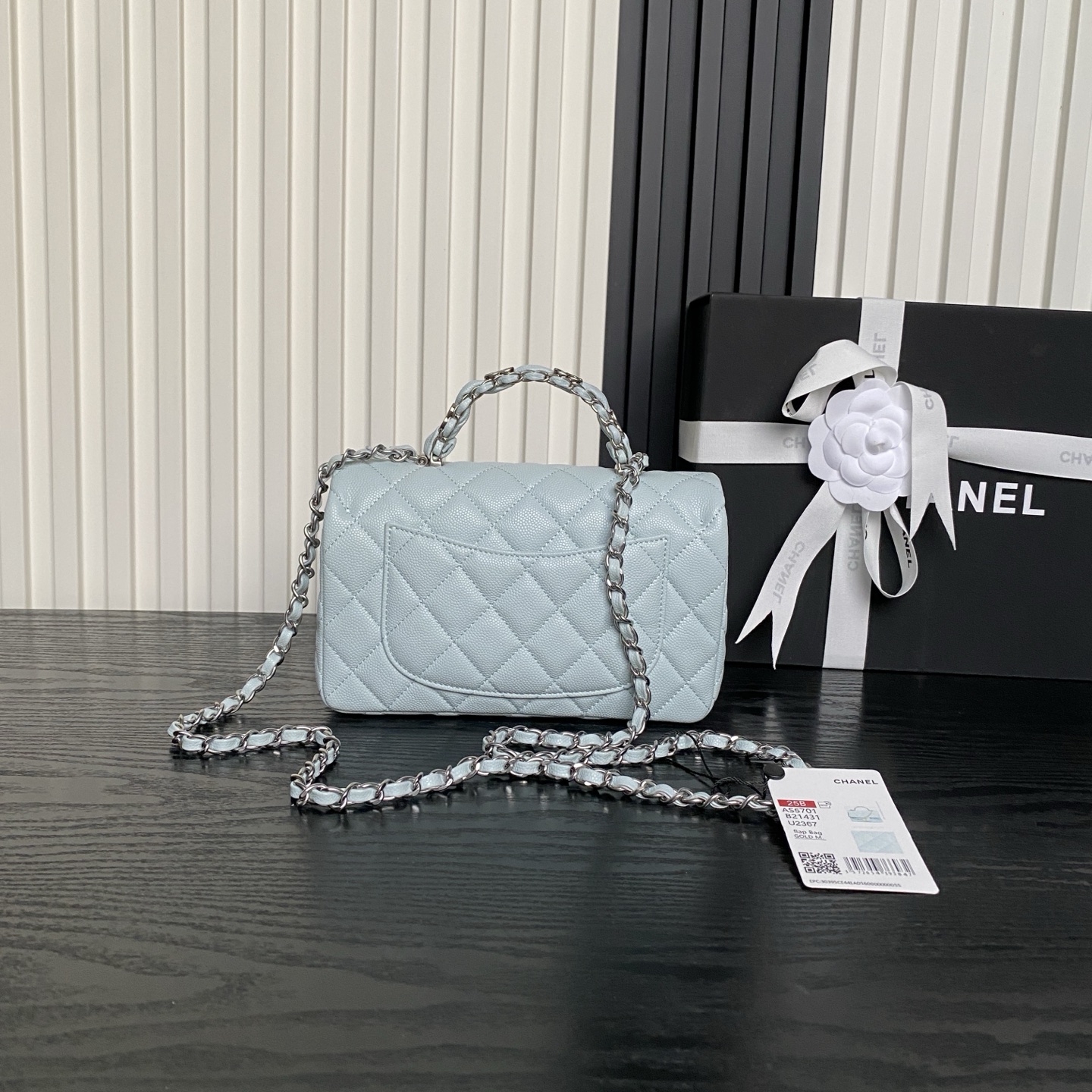 I absolutely love this Chanel mini bag! The light blue color is so unique and beautiful. The handle design is also very chic and makes it stand out from other bags. Definitely worth the investment!