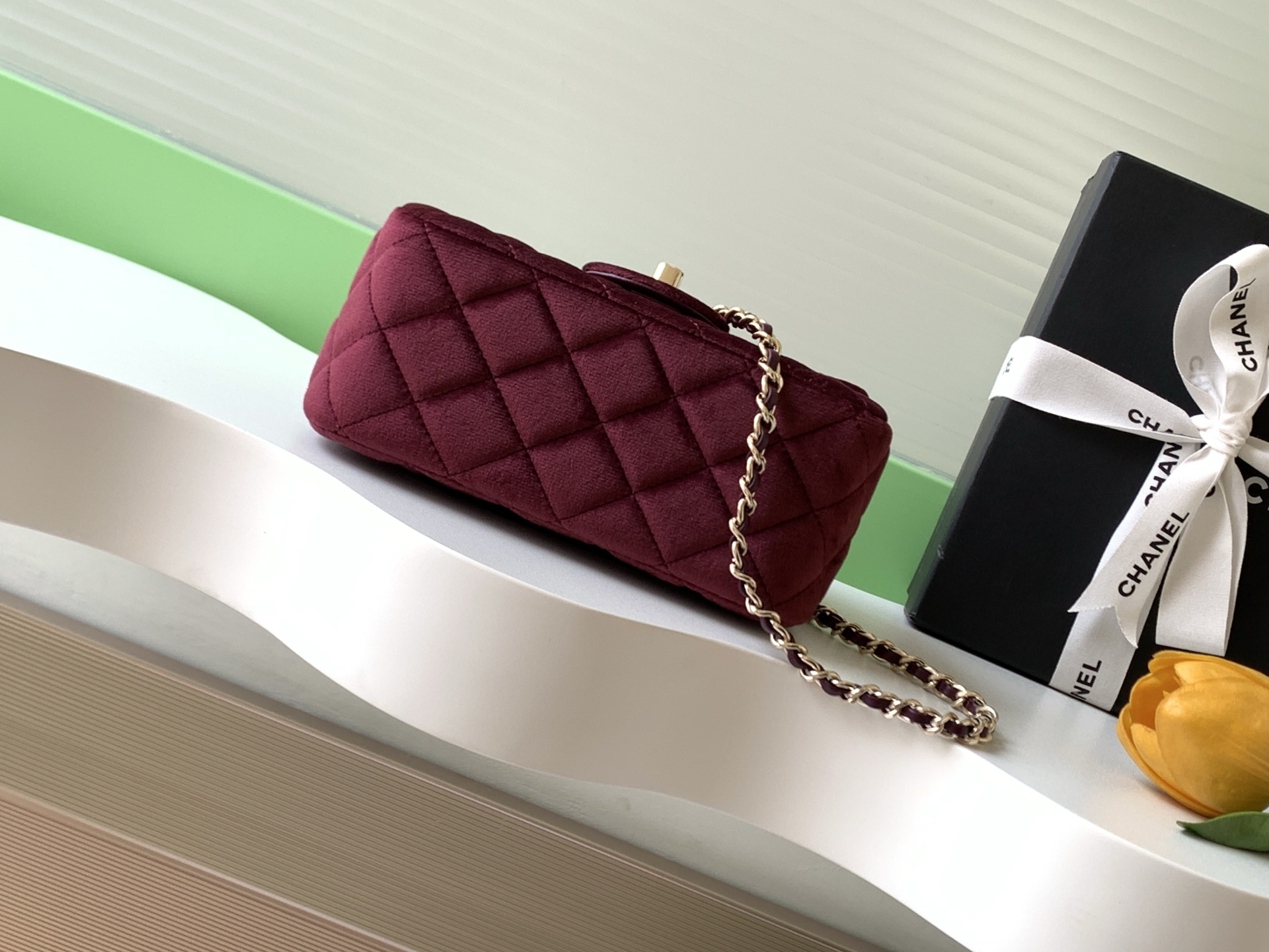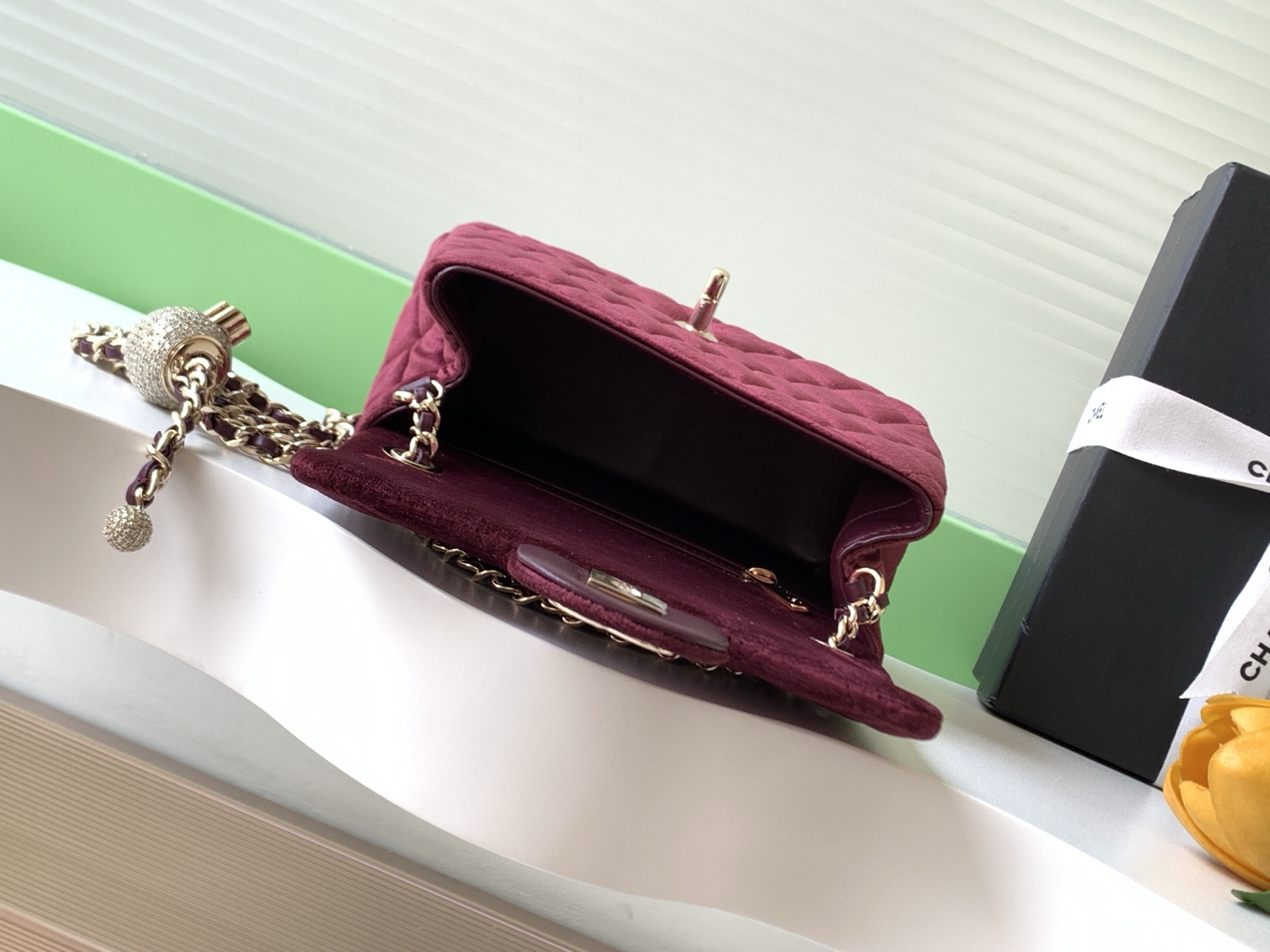 Tags: Burgundy Flap Bag, Chanel Velvet Bag, Classic Flap Bag, Designer Shoulder Bag, Diamond Ball Bag, Luxury Handbag