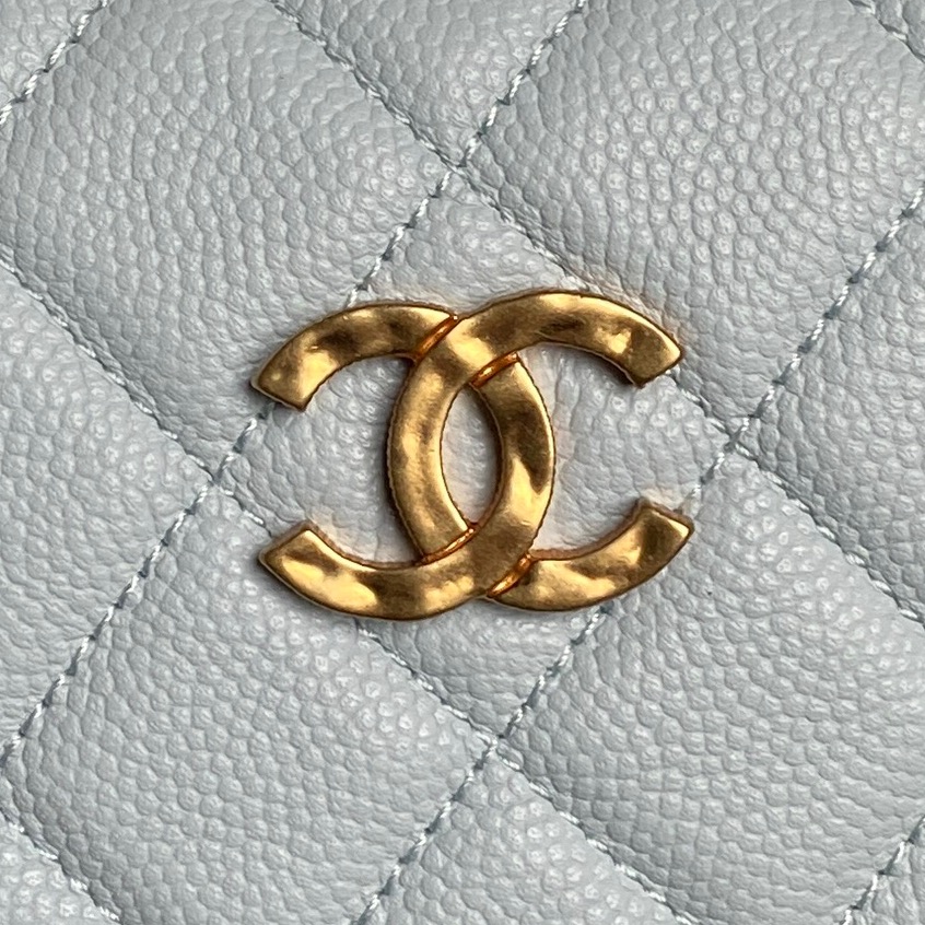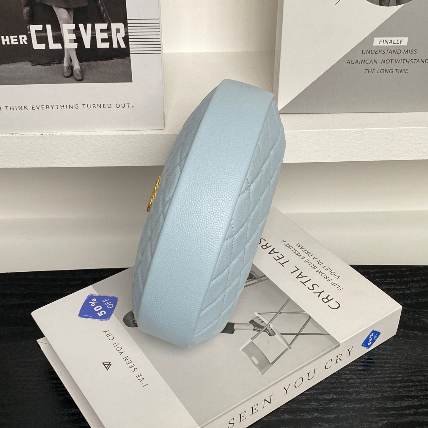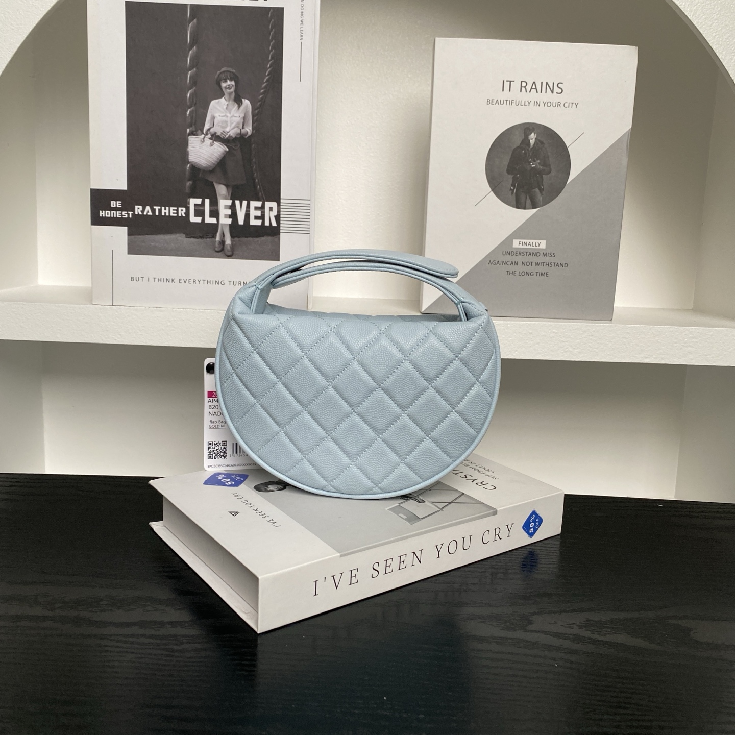 Tags: Chanel Crescent Bag, Designer Mini Bag, Luxury Shoulder Bag, Pearl Chain Bag, Powder Blue Bag, Small Leather Handbag