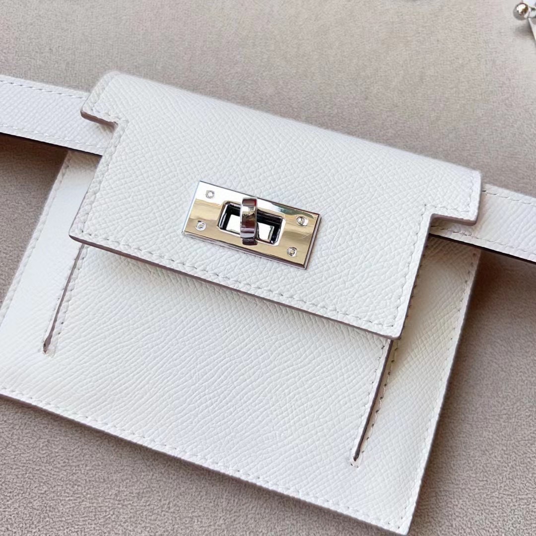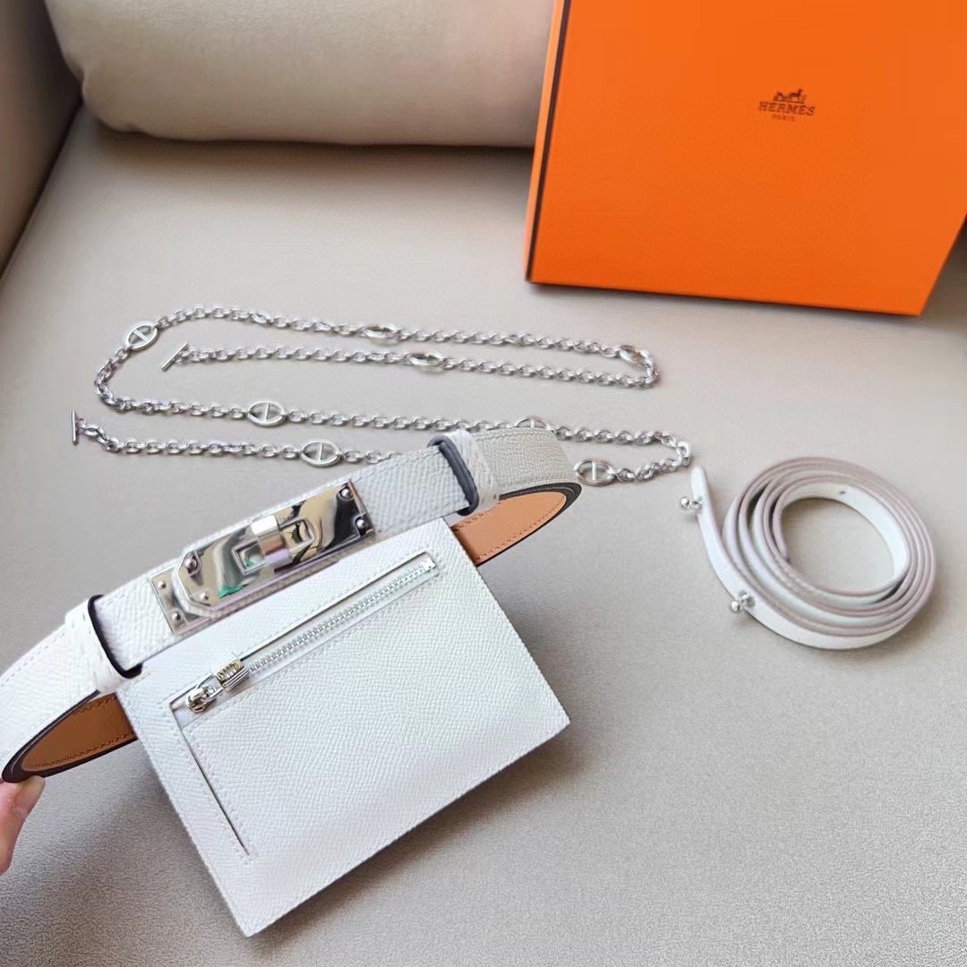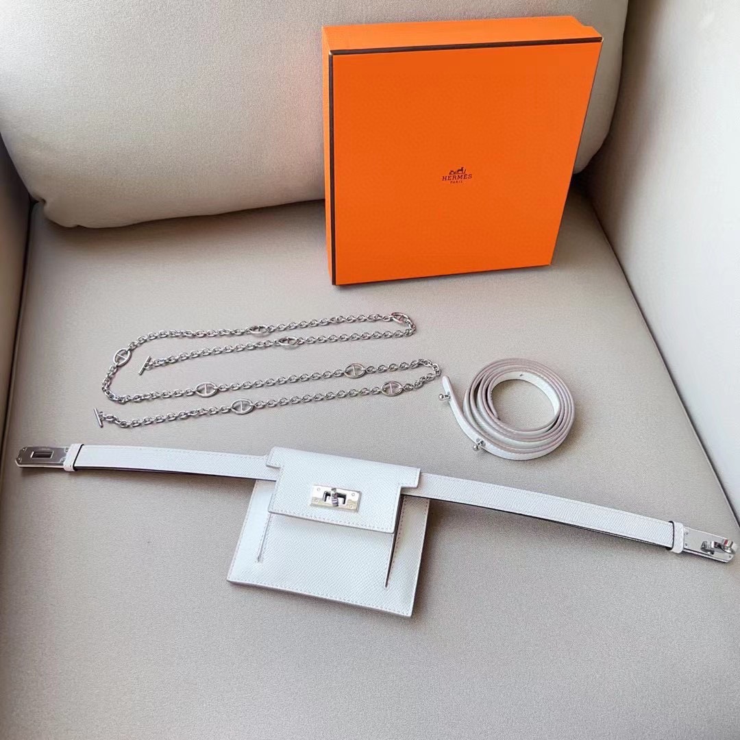 Tags: Designer Belt Bag, Hermes Belt Bag, Luxury Belt Bag, Silver Chain Belt Bag, White Leather Belt Bag