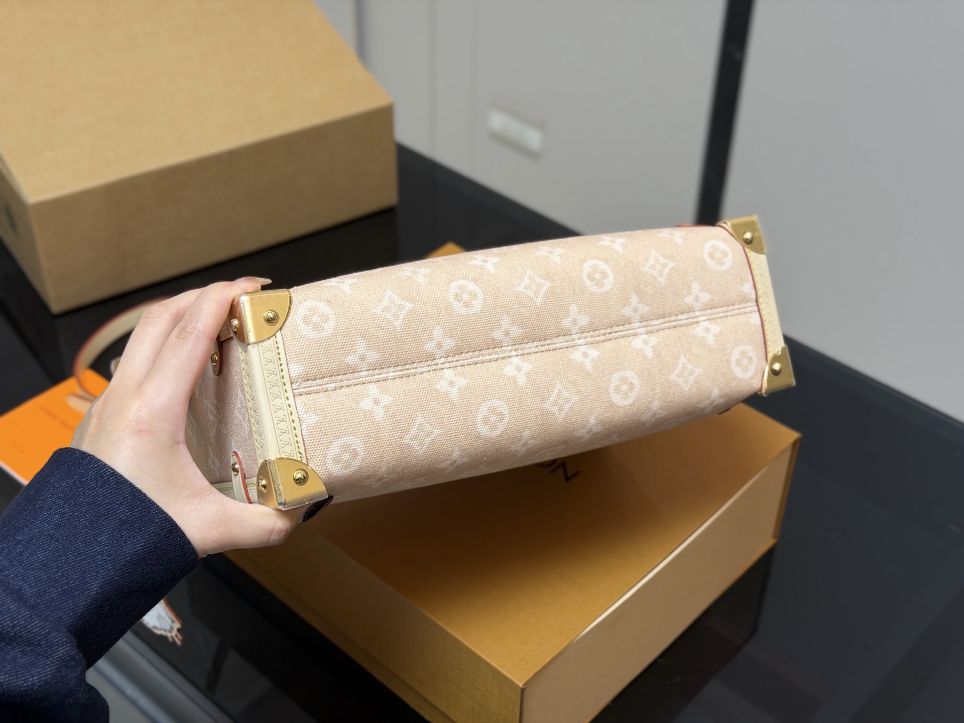 - Design: Features a iconic Monogram pattern in a soft pastel pink color.