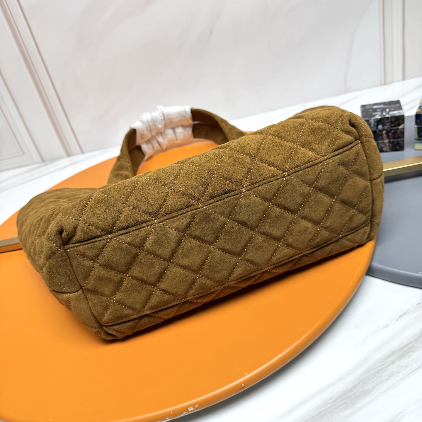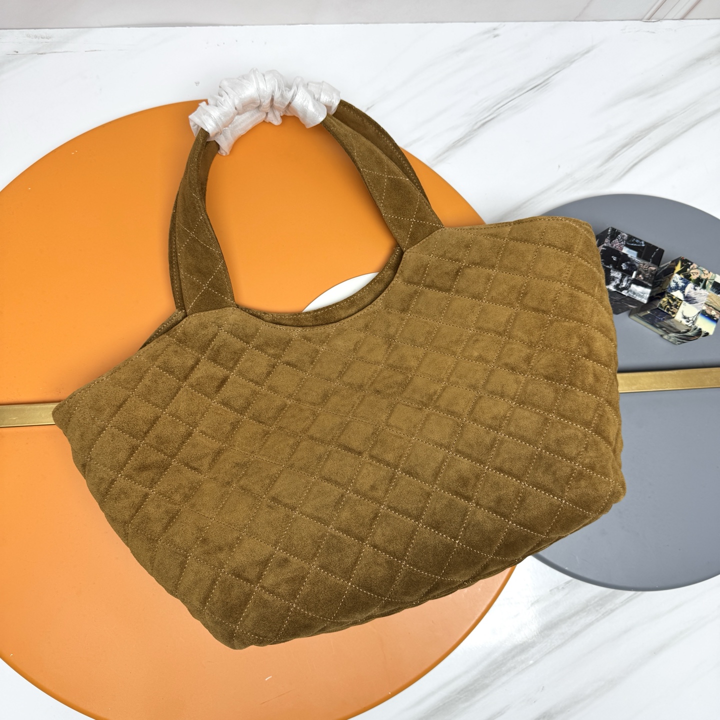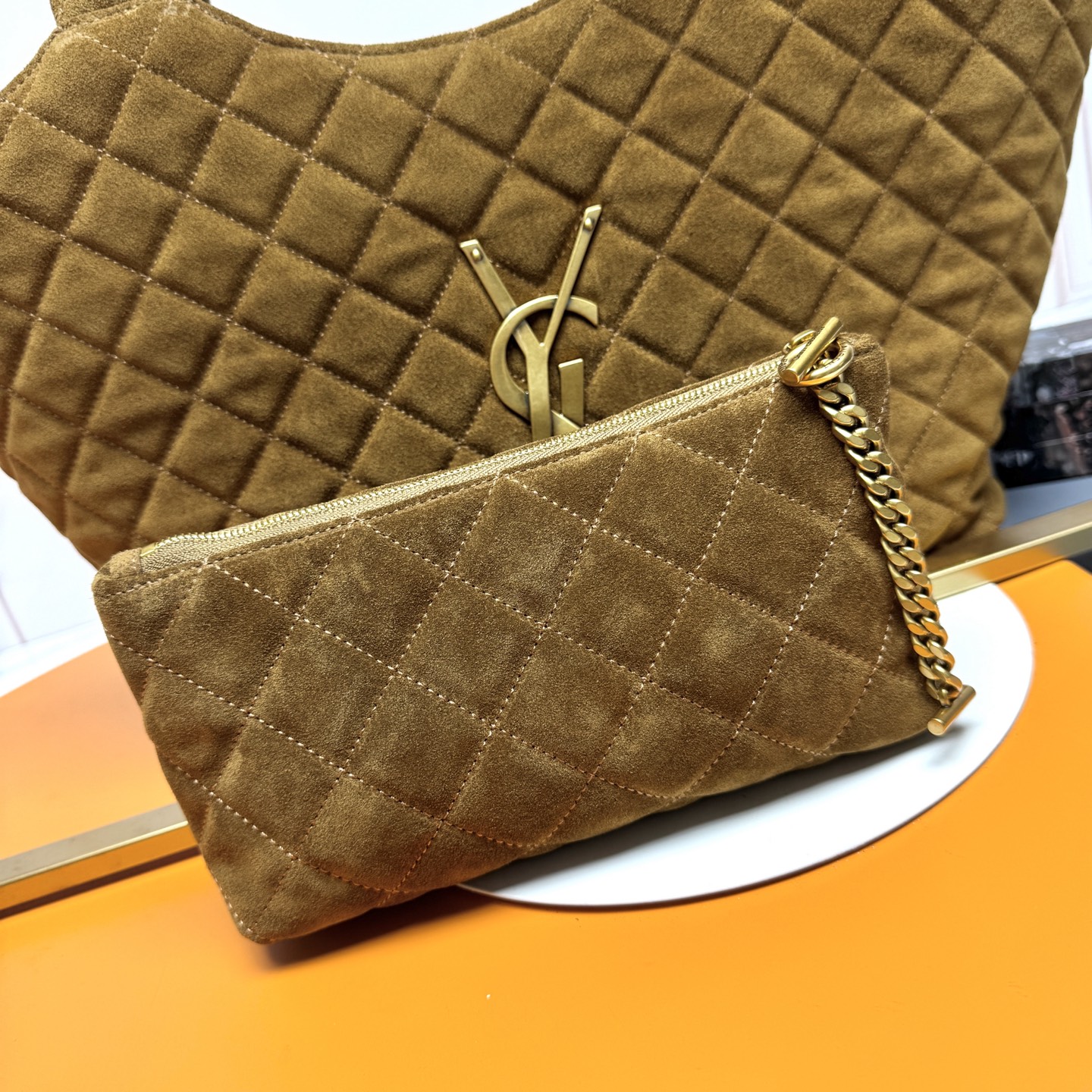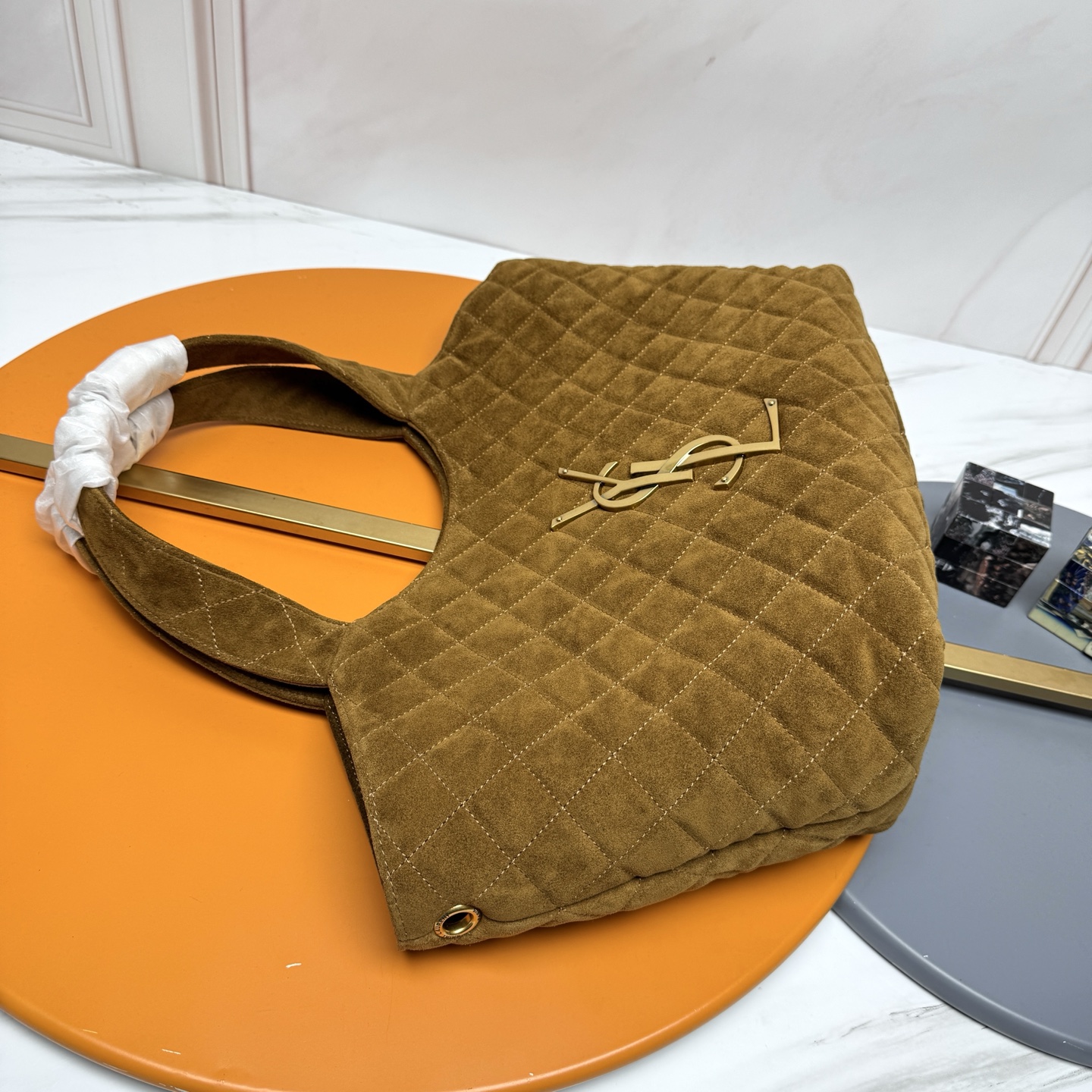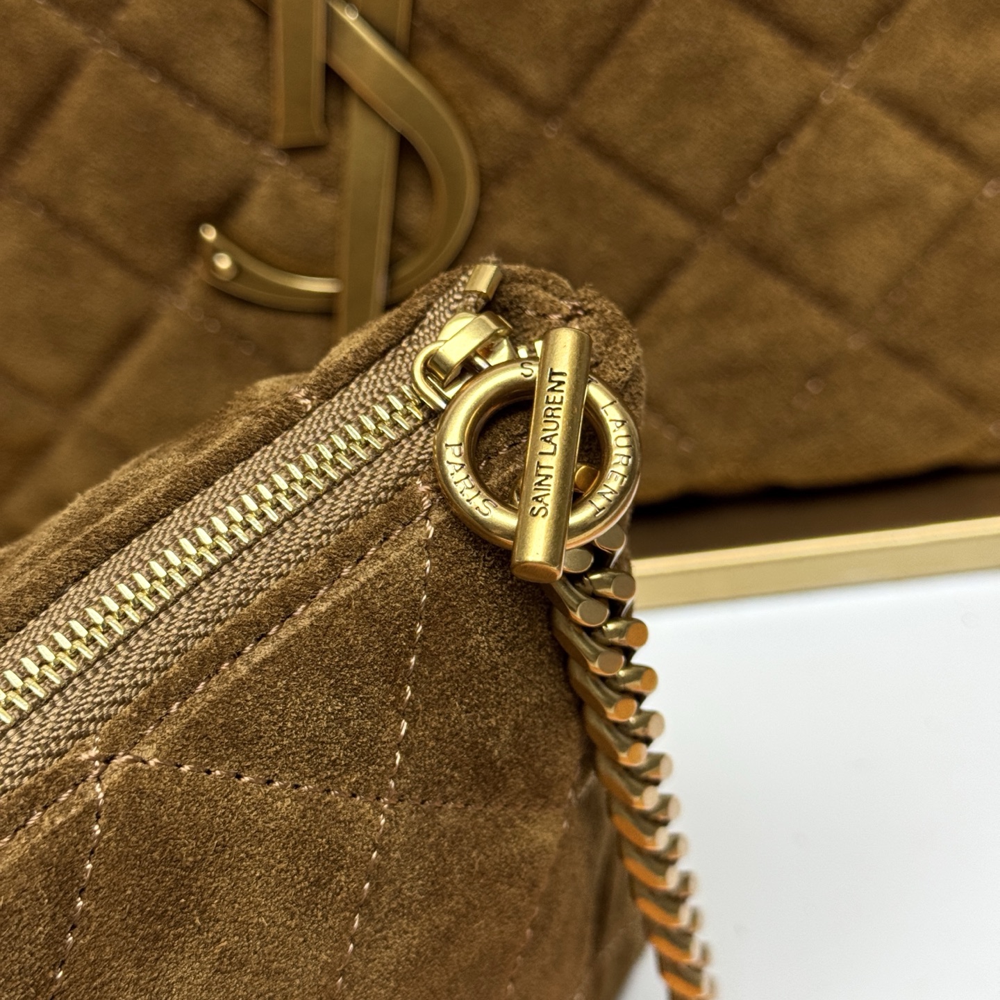Tags: Designer Shopping Bag, Gold Hardware Bag, Luxury Tote Bag, Quilted Tote Bag, Saint Laurent Tote Bag, Suede Leather Handbag