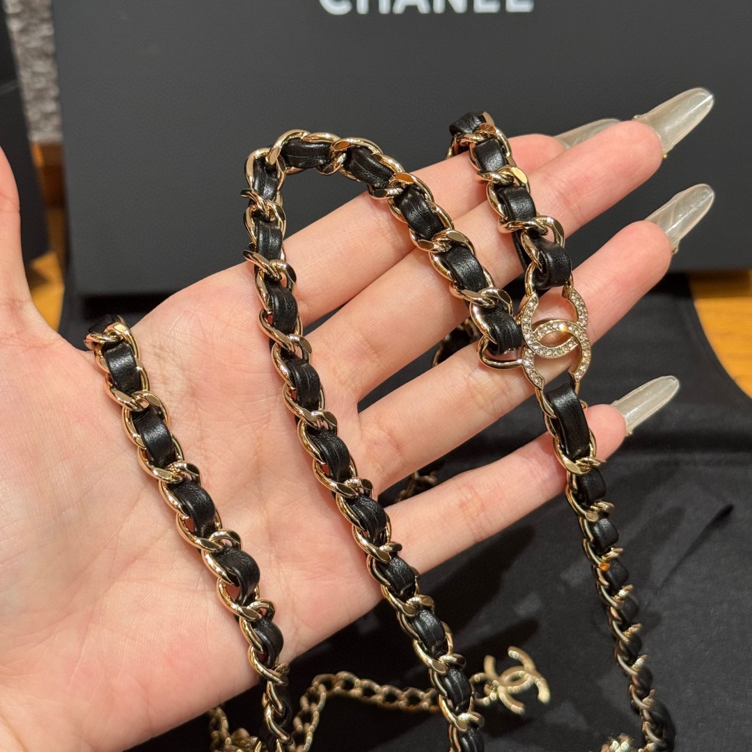 This exquisite chain belt from Chanel features a luxurious blend of metal, calfskin, and sparkling rhinestones. The gold, black, and crystal color palette adds a touch of elegance, making it a versatile accessory for any outfit.