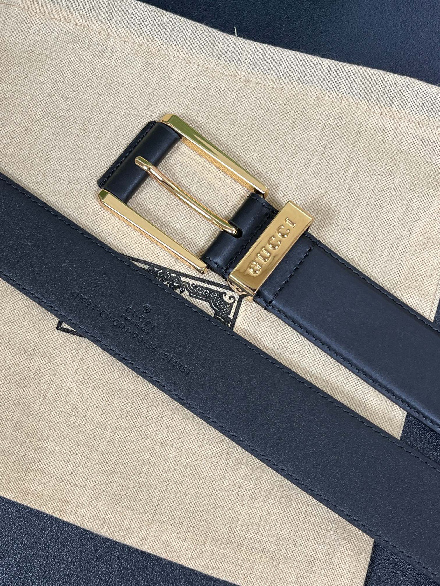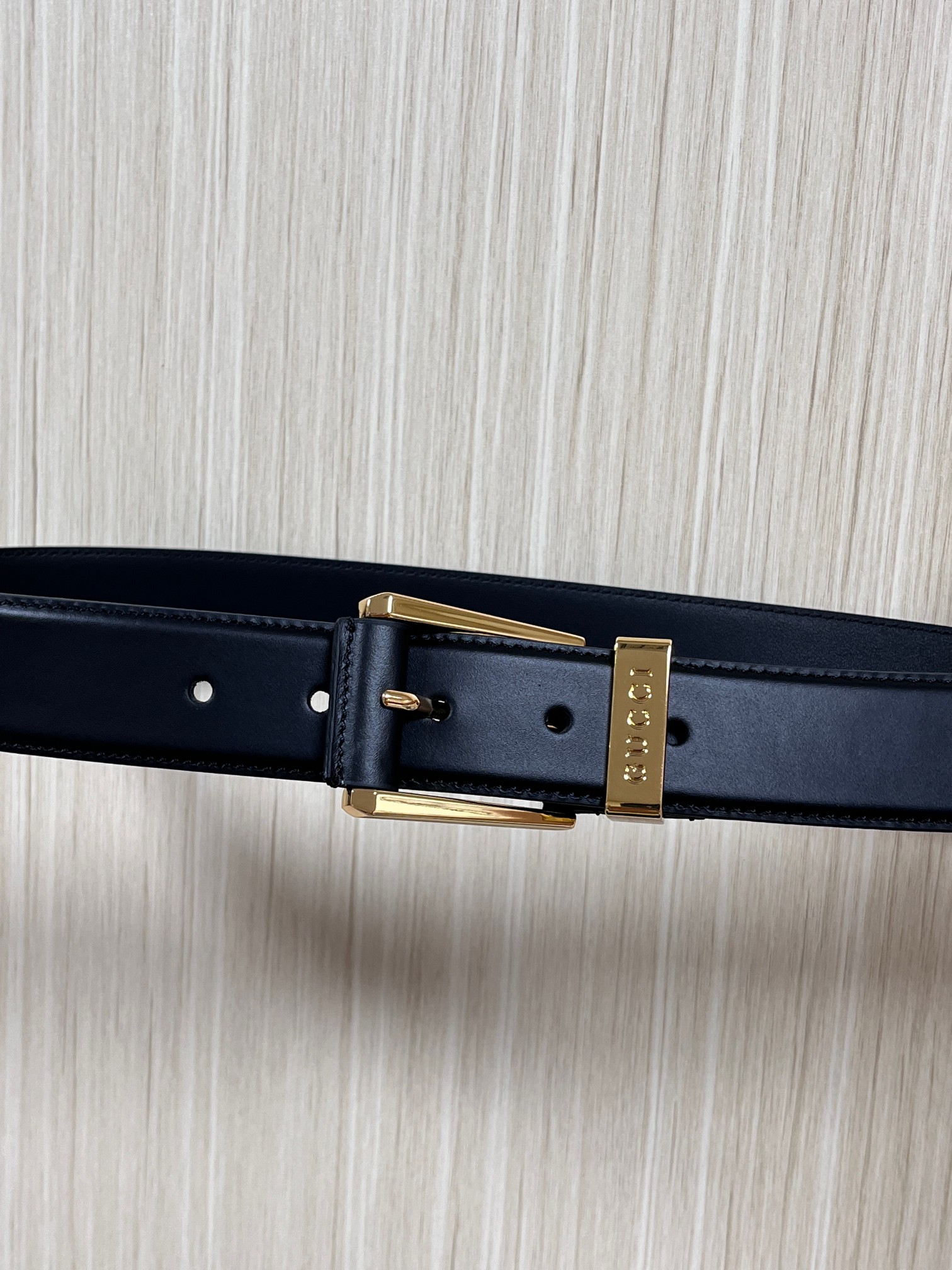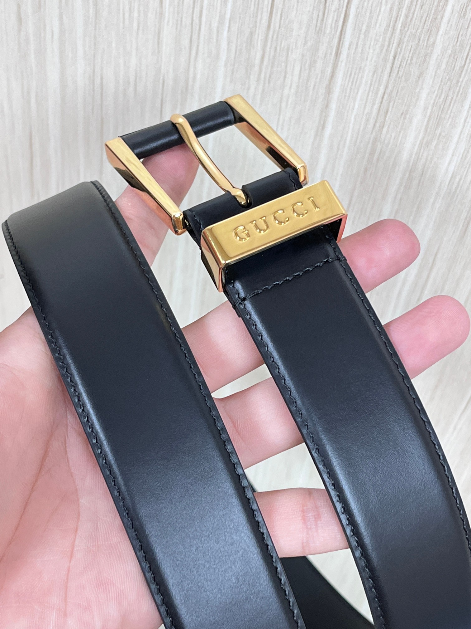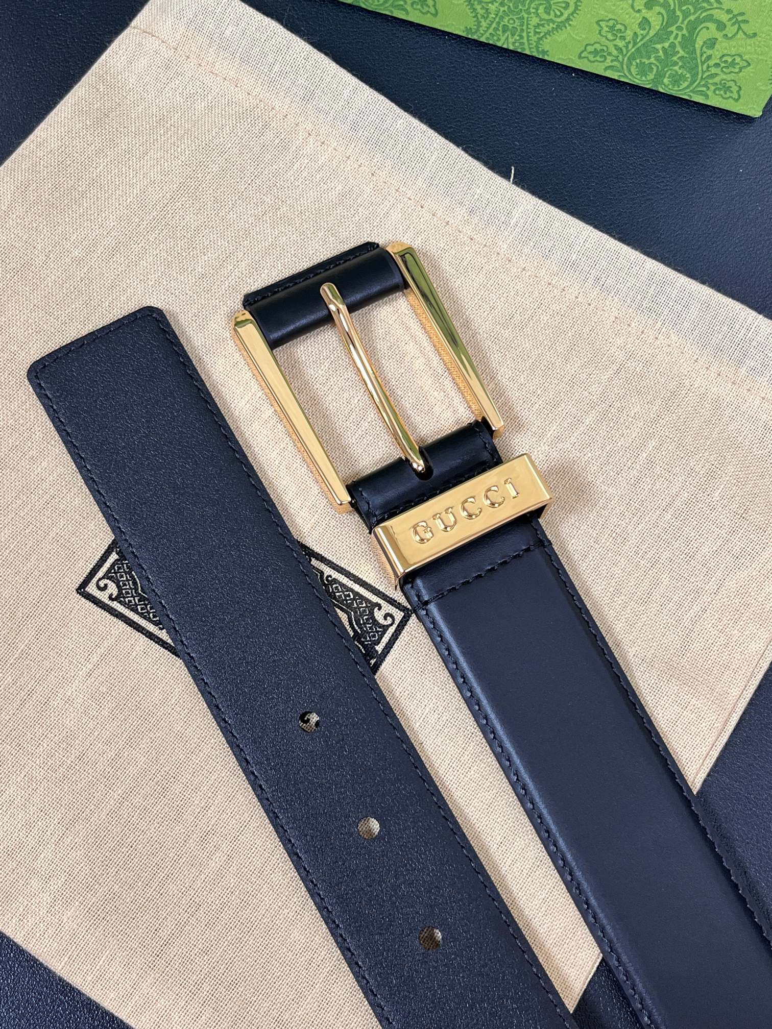 - Features a distinctive square buckle with Gucci engraving