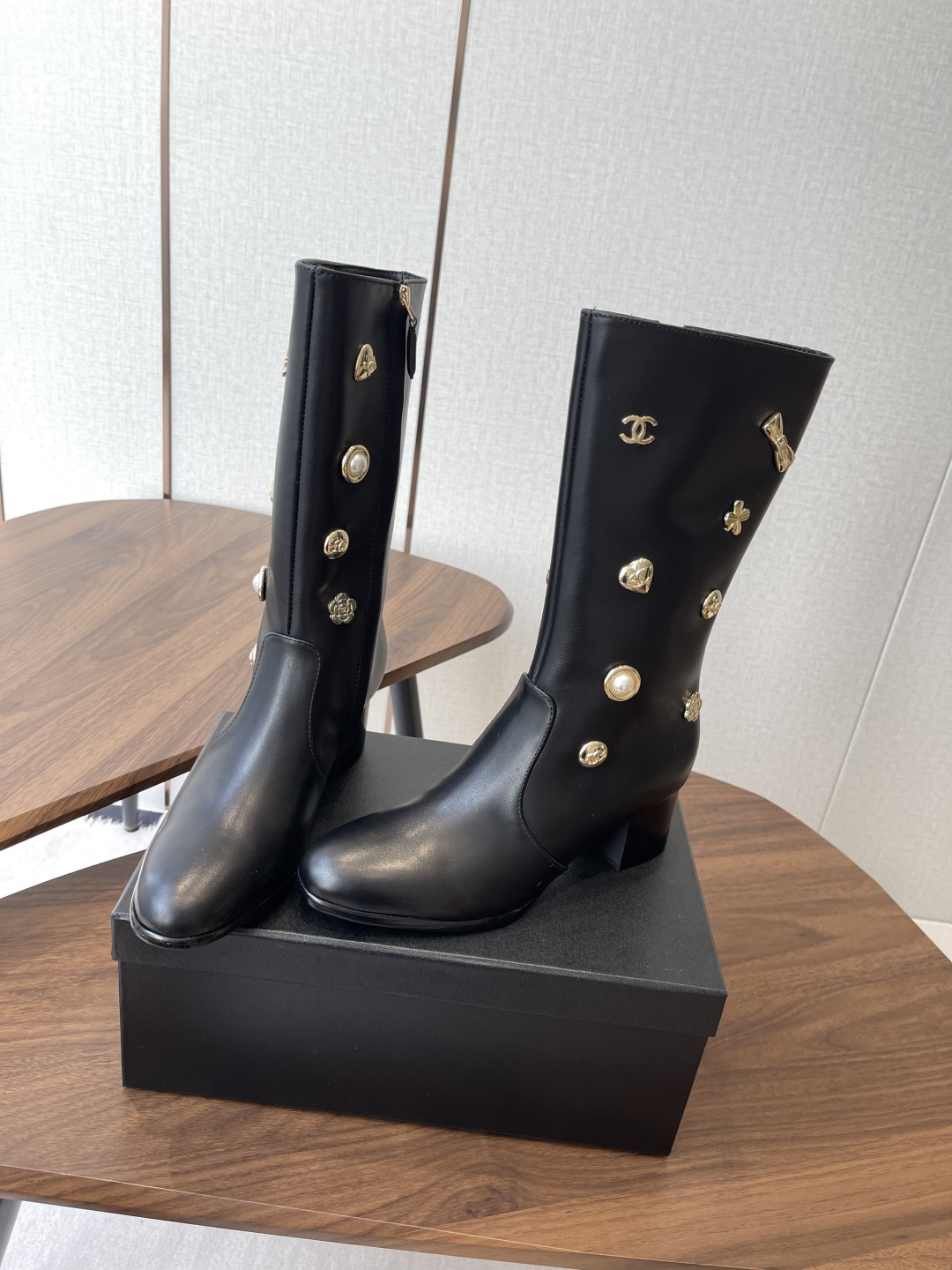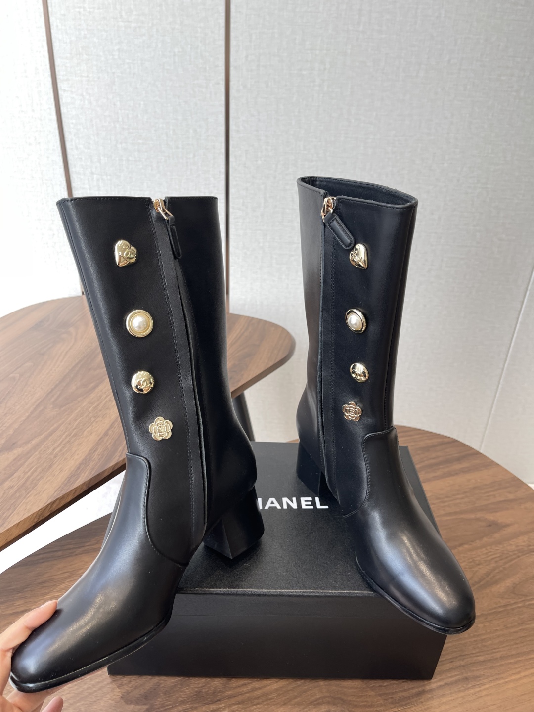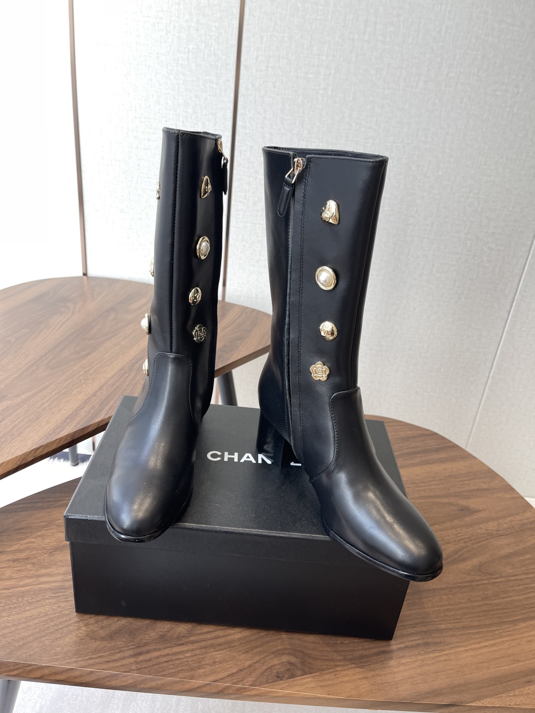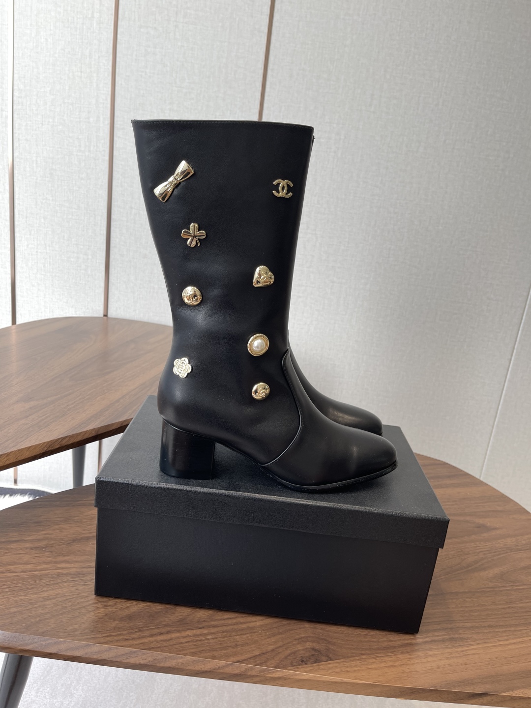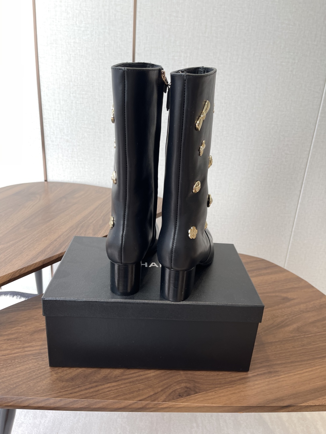 Tags: Black Leather Boots, Chanel Mid-Calf Boots, Embellished Boots, Round Toe Boots, Zip Closure Boots