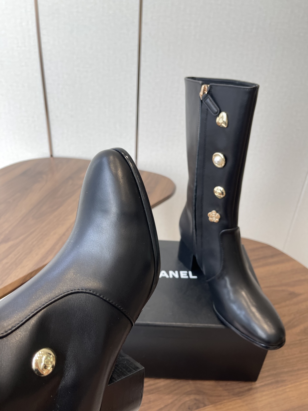 These Chanel mid-calf boots are a chic and stylish addition to any wardrobe, perfect for adding a touch of sophistication to your look.