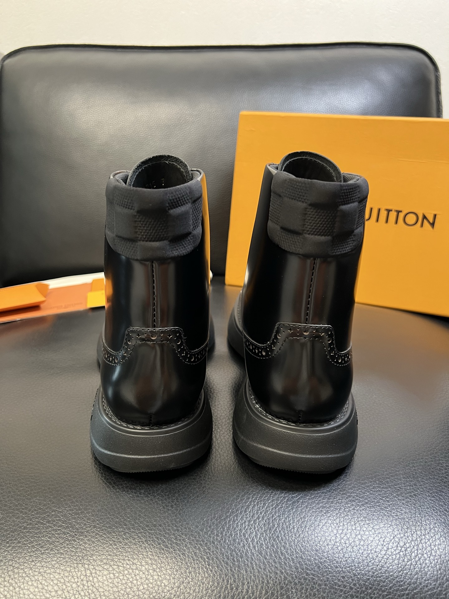 Elevate your style with these Louis Vuitton high-top boots. Crafted with premium Italian leather and a comfortable TPU sole. Perfect for any occasion.