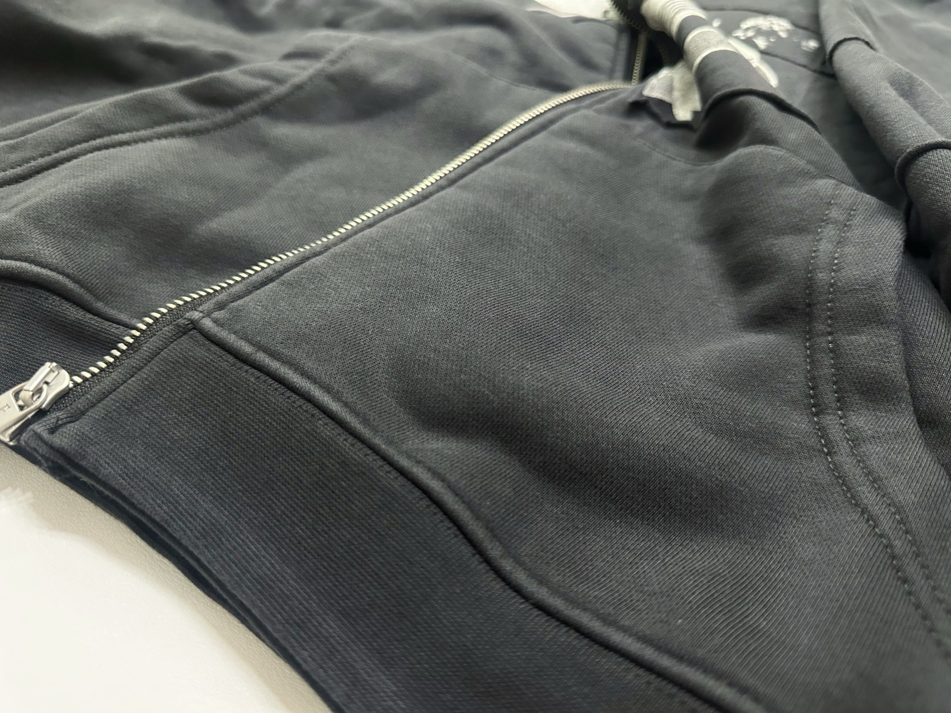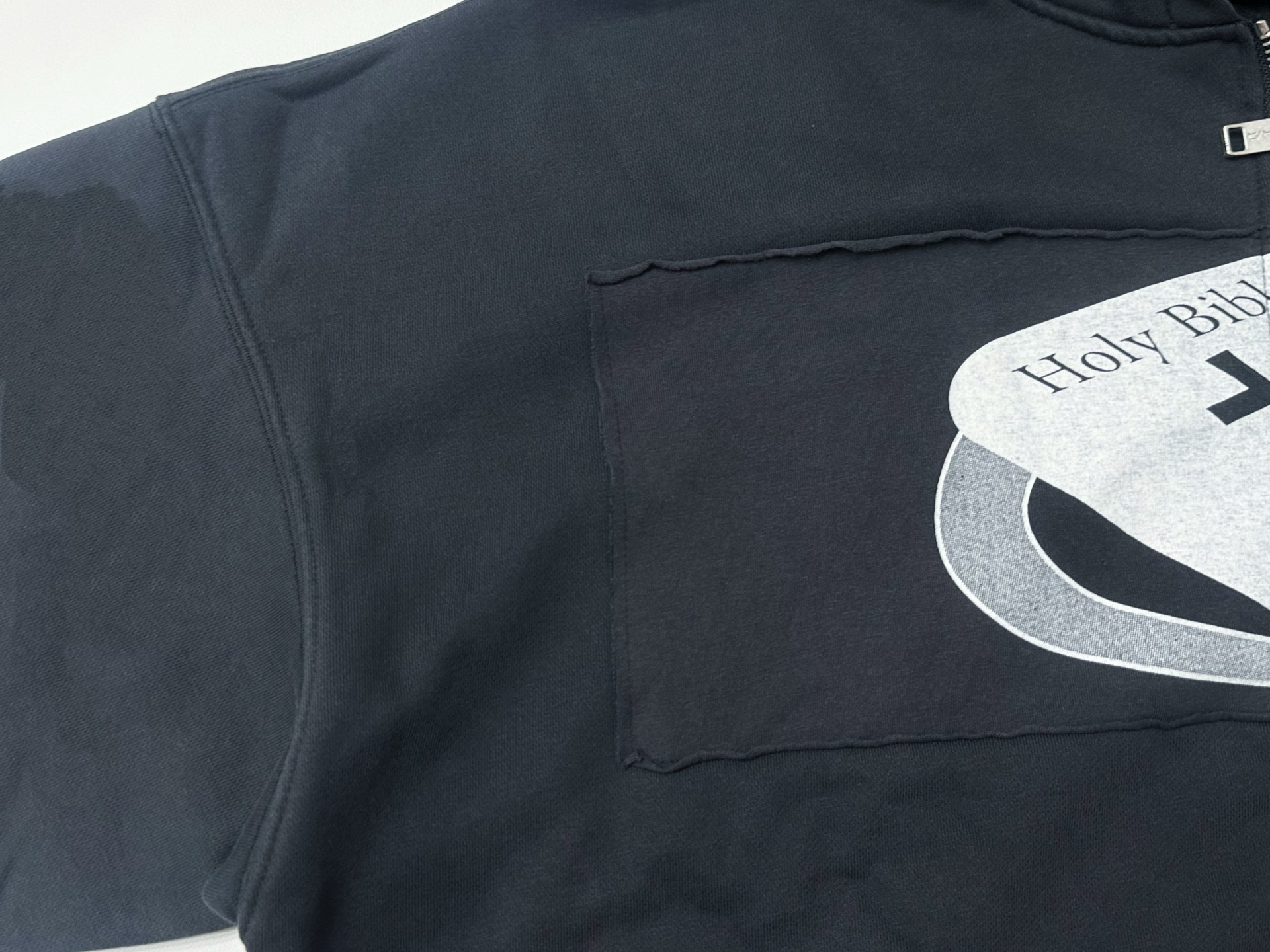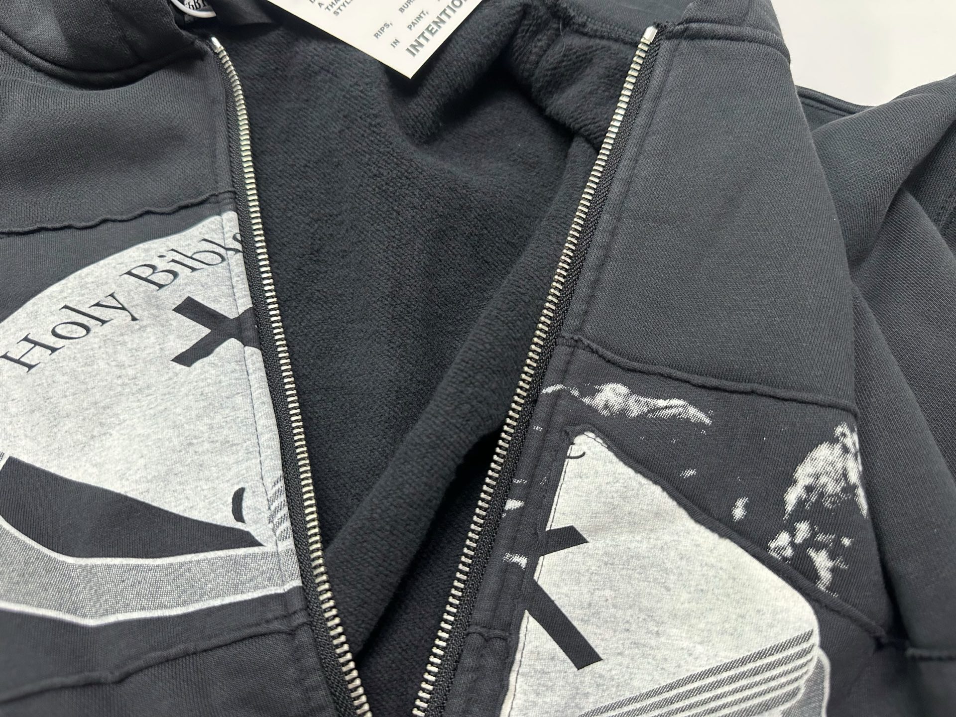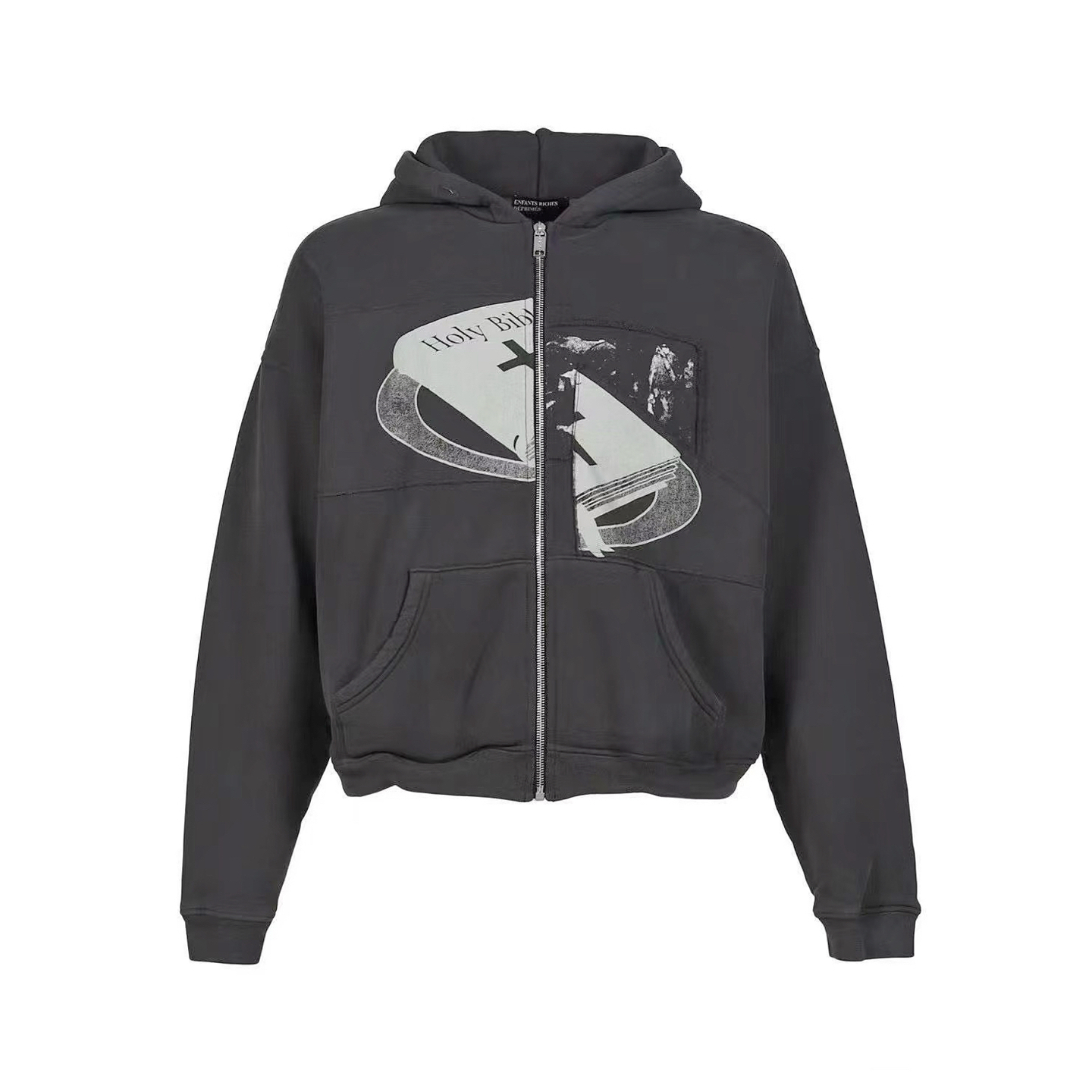 Elevate your streetwear with this ERD zip-up hoodie featuring a 'Holy Bible' patch. A blend of luxury and rebellious style.