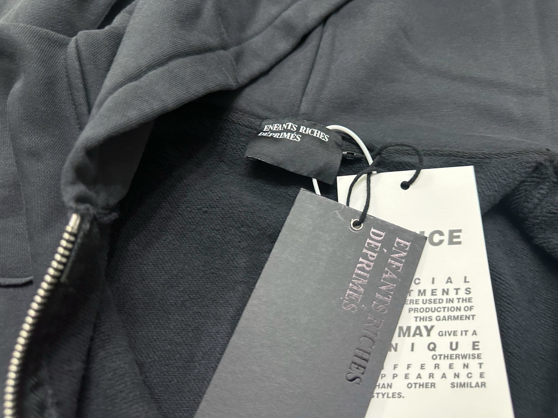 This Enfants Riches Deprimes zip-up hoodie is a statement piece that blends high fashion with streetwear edge. The 'Holy Bible' patch adds a unique, rebellious touch to the classic hoodie design, making it a standout addition to any wardrobe.