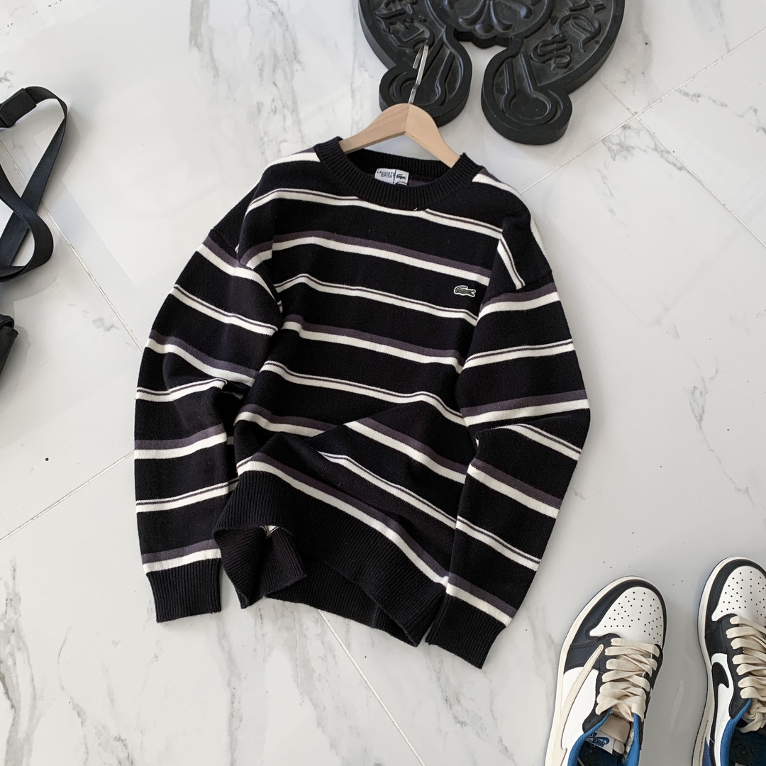 Tags: Classic Knitwear, Comfortable Sweater, Lacoste Knit Sweater, Men's Fall Sweater, Striped Wool Sweater, Stylish Layering Piece