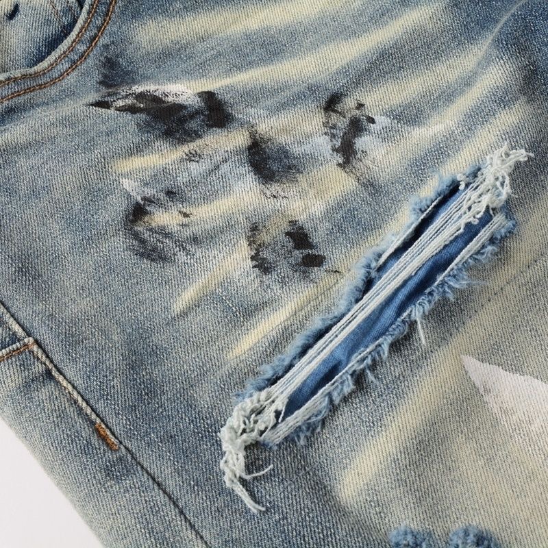 - Distressed detailing with rips and abrasions for a unique, edgy look.