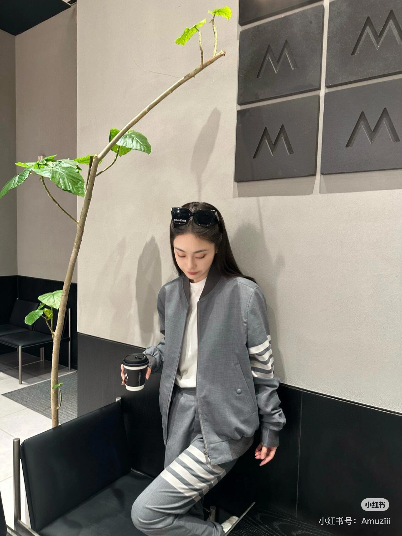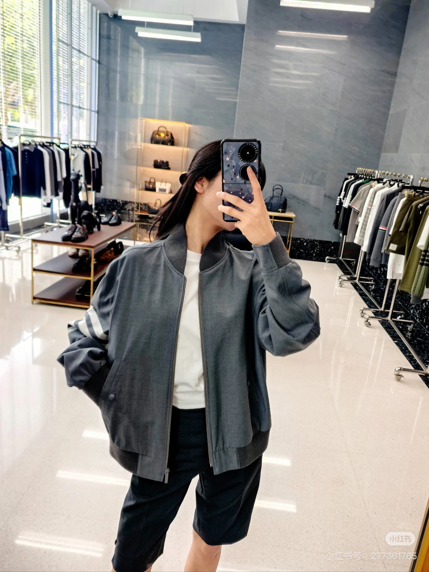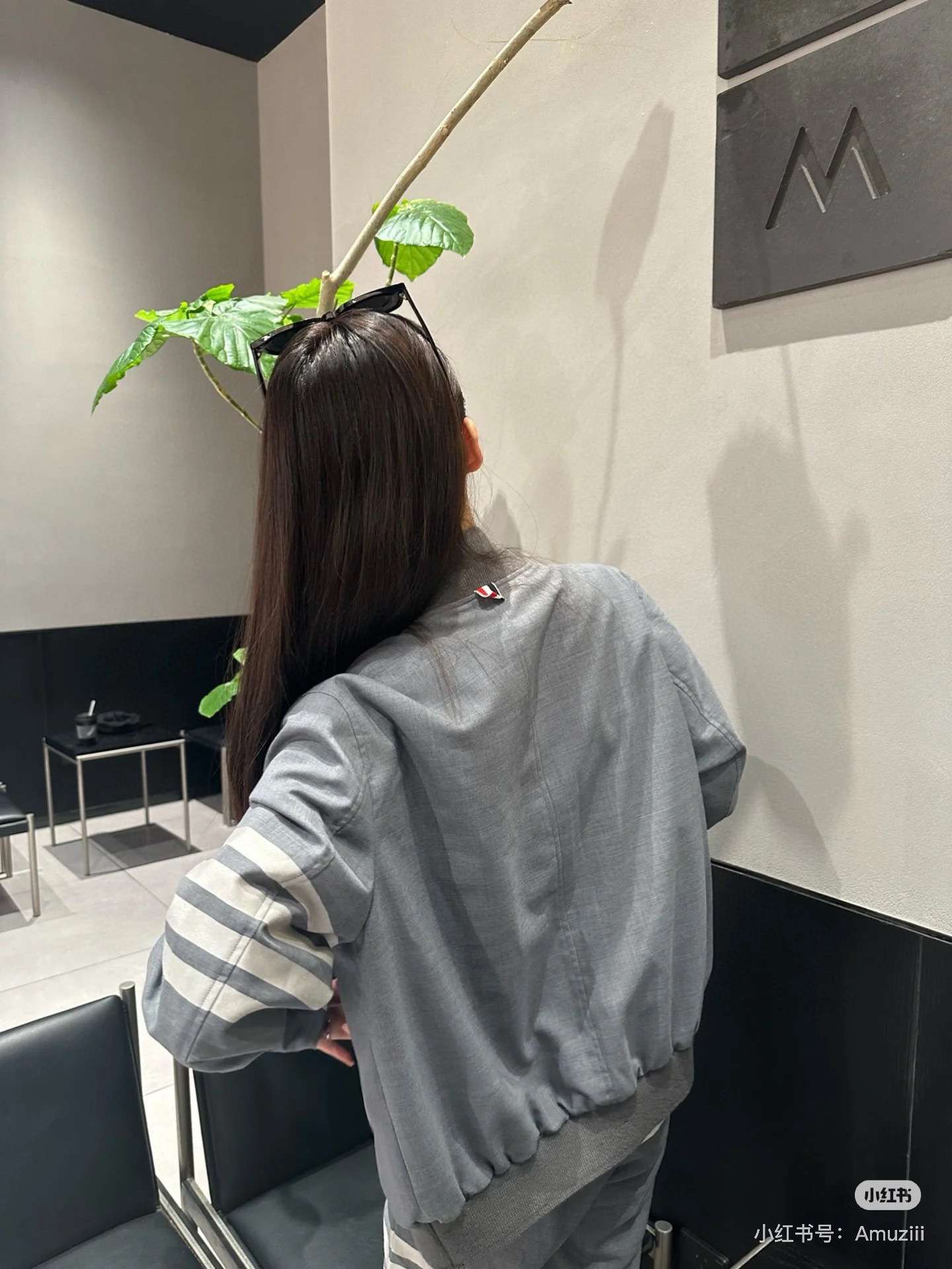 Tags: Cotton Blend Jacket, Designer Bomber Jacket, Four Bar Stripe Jacket, Gray Jacket Women, Luxury Outerwear, Thom Browne Bomber Jacket