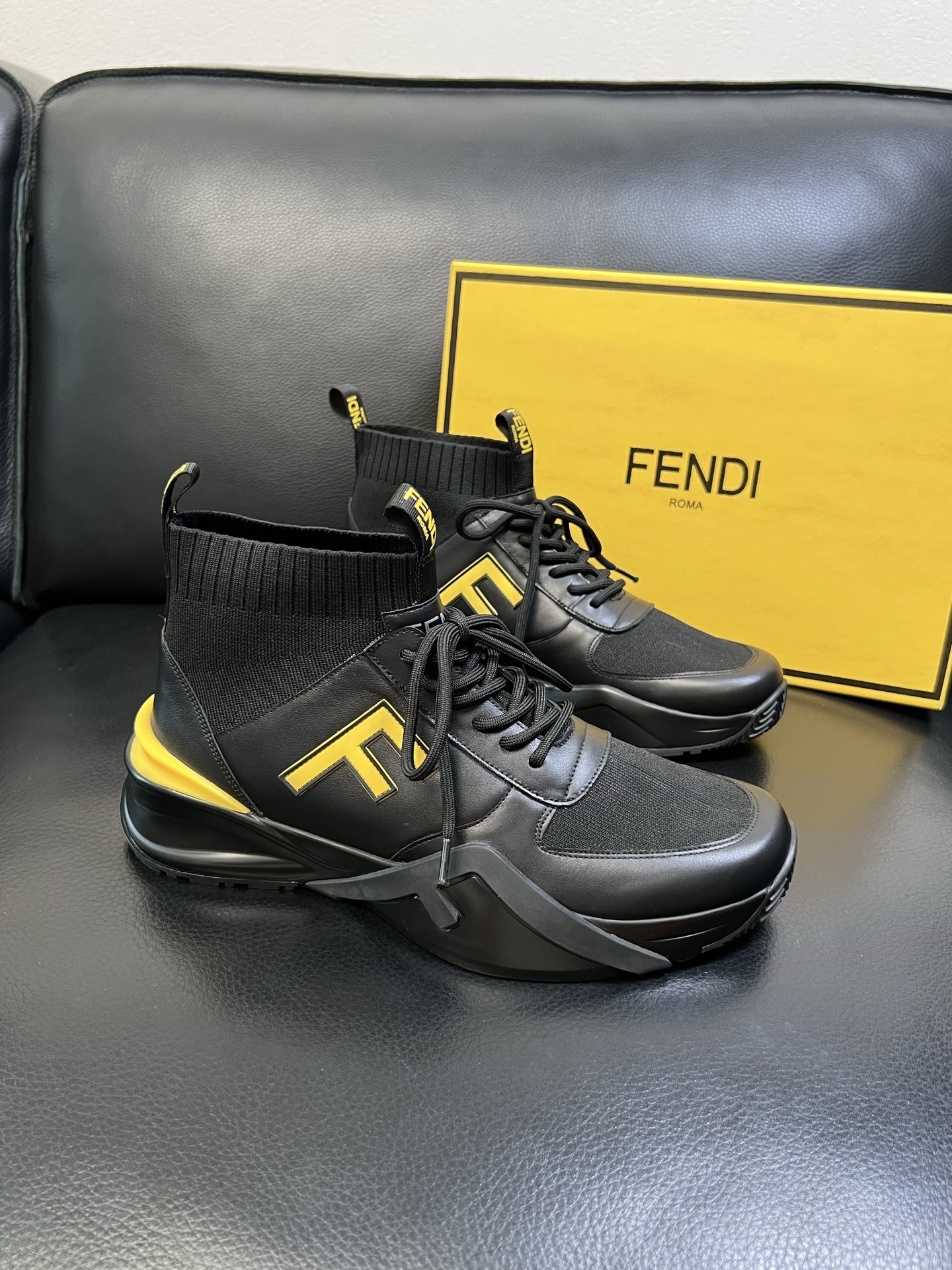 Tags: Fendi High-Top Sneakers, Italian Leather Sneakers, Leather Knit Sneakers, Luxury Athletic Shoes, Men's Designer Sneakers