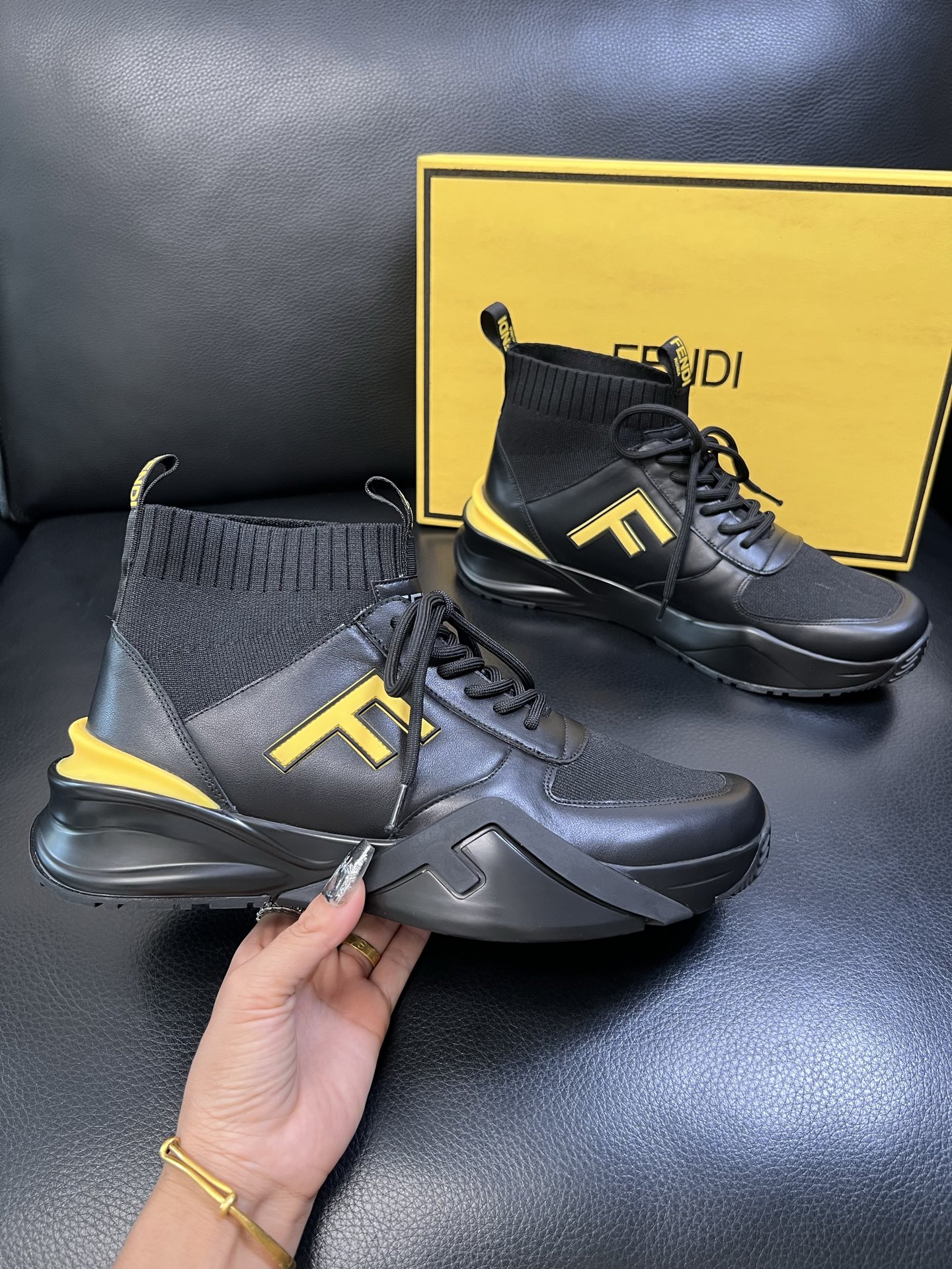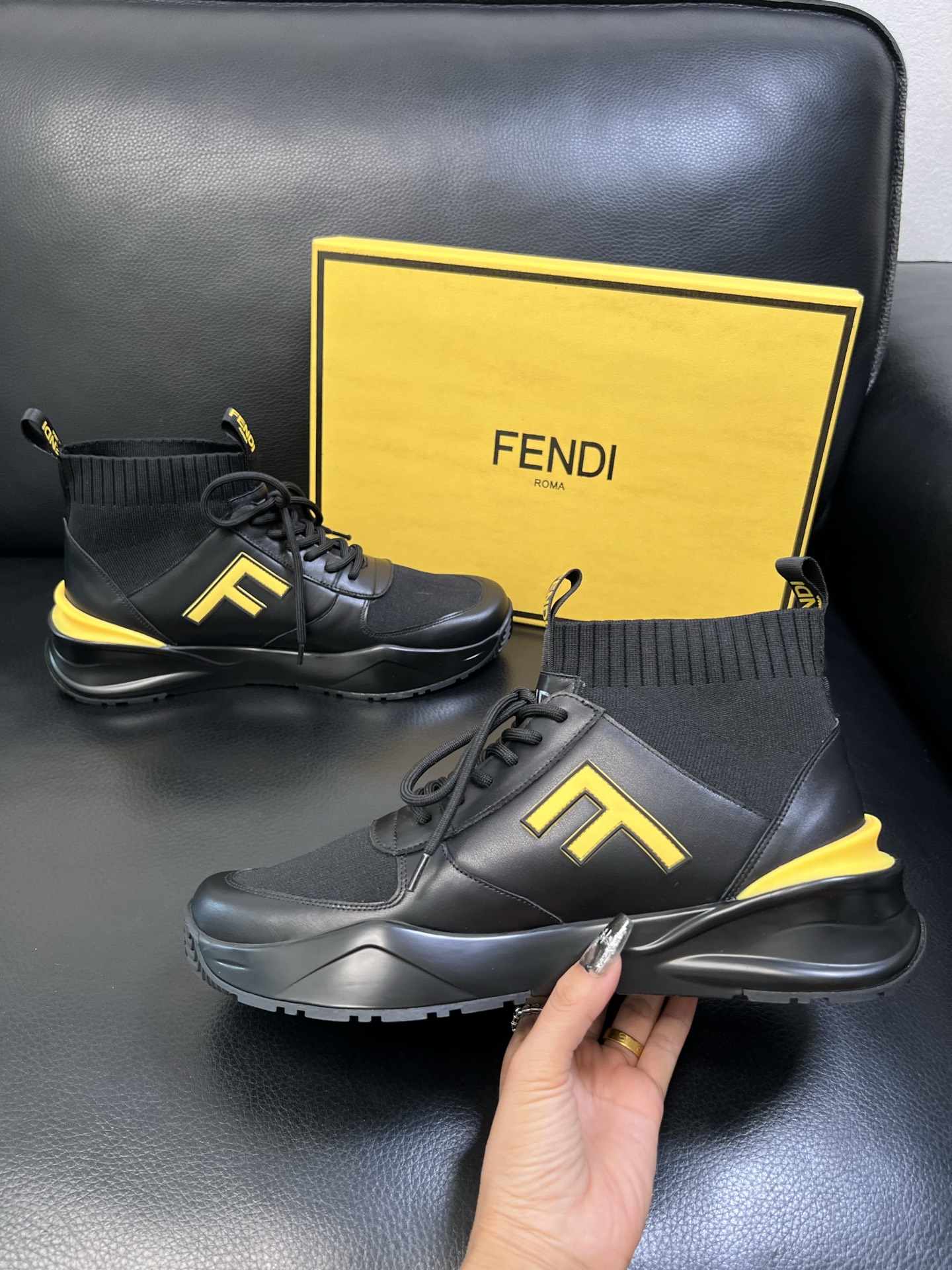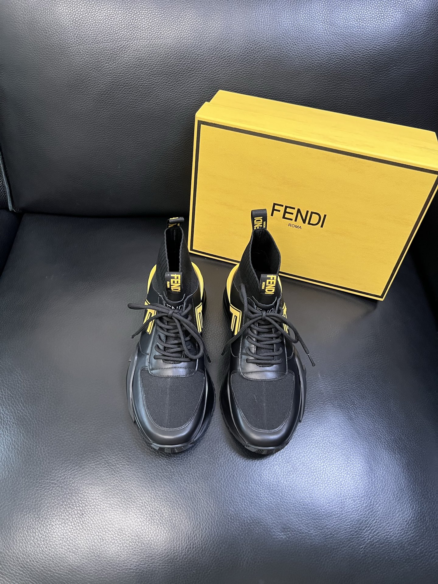 Step up your footwear game with these high-quality Fendi sneakers, featuring premium leather, knit fabric, and iconic Fendi design.