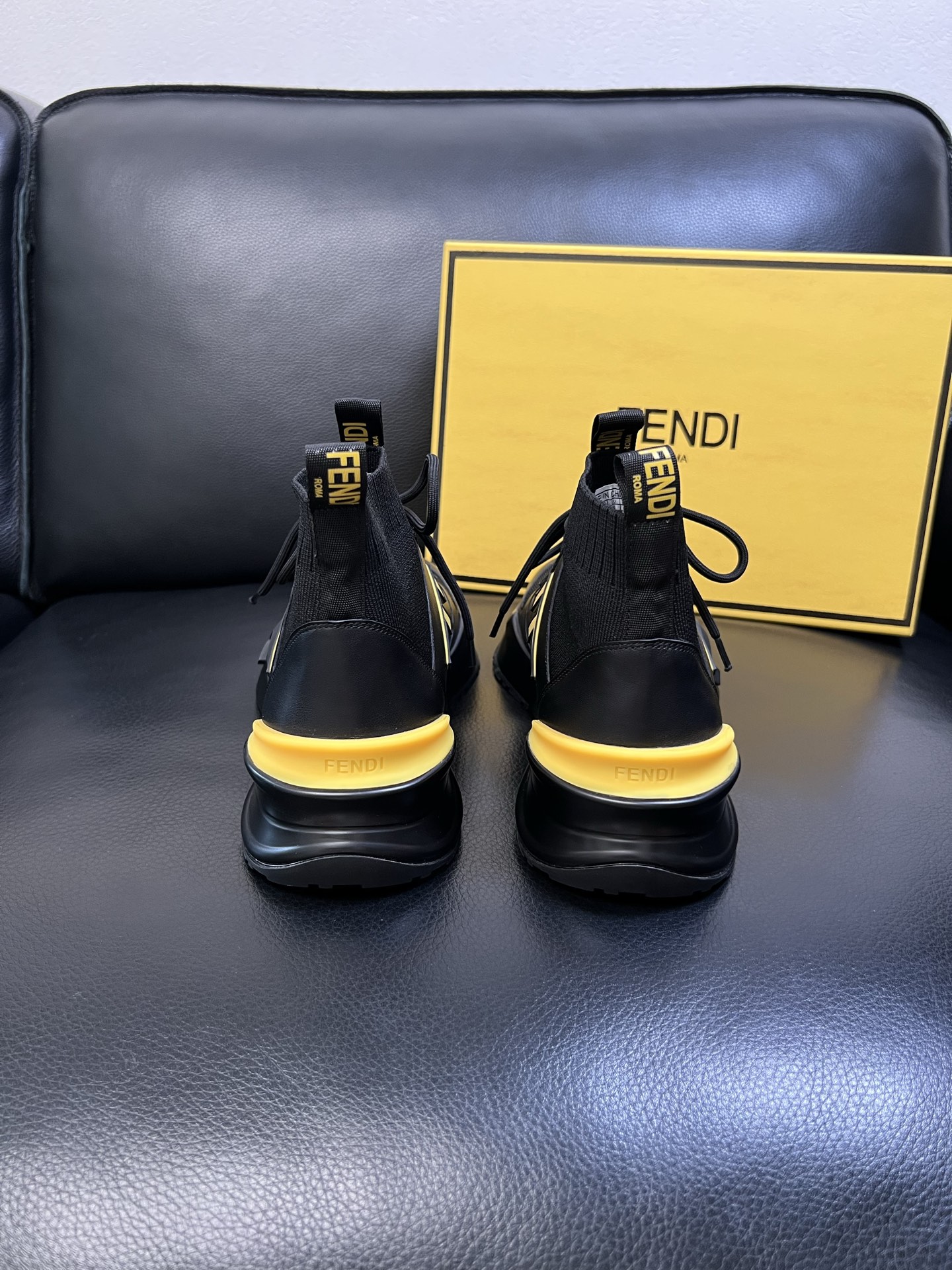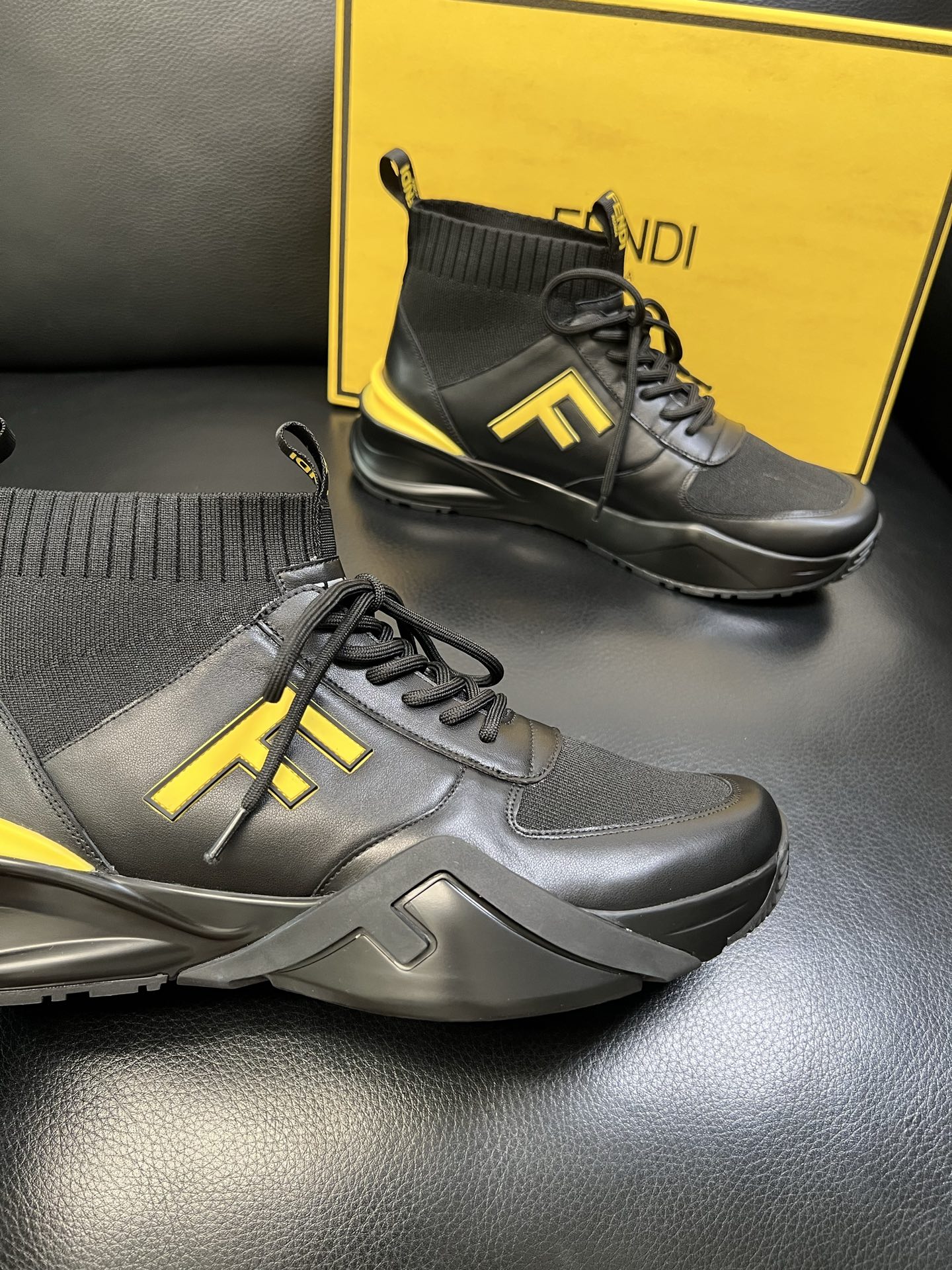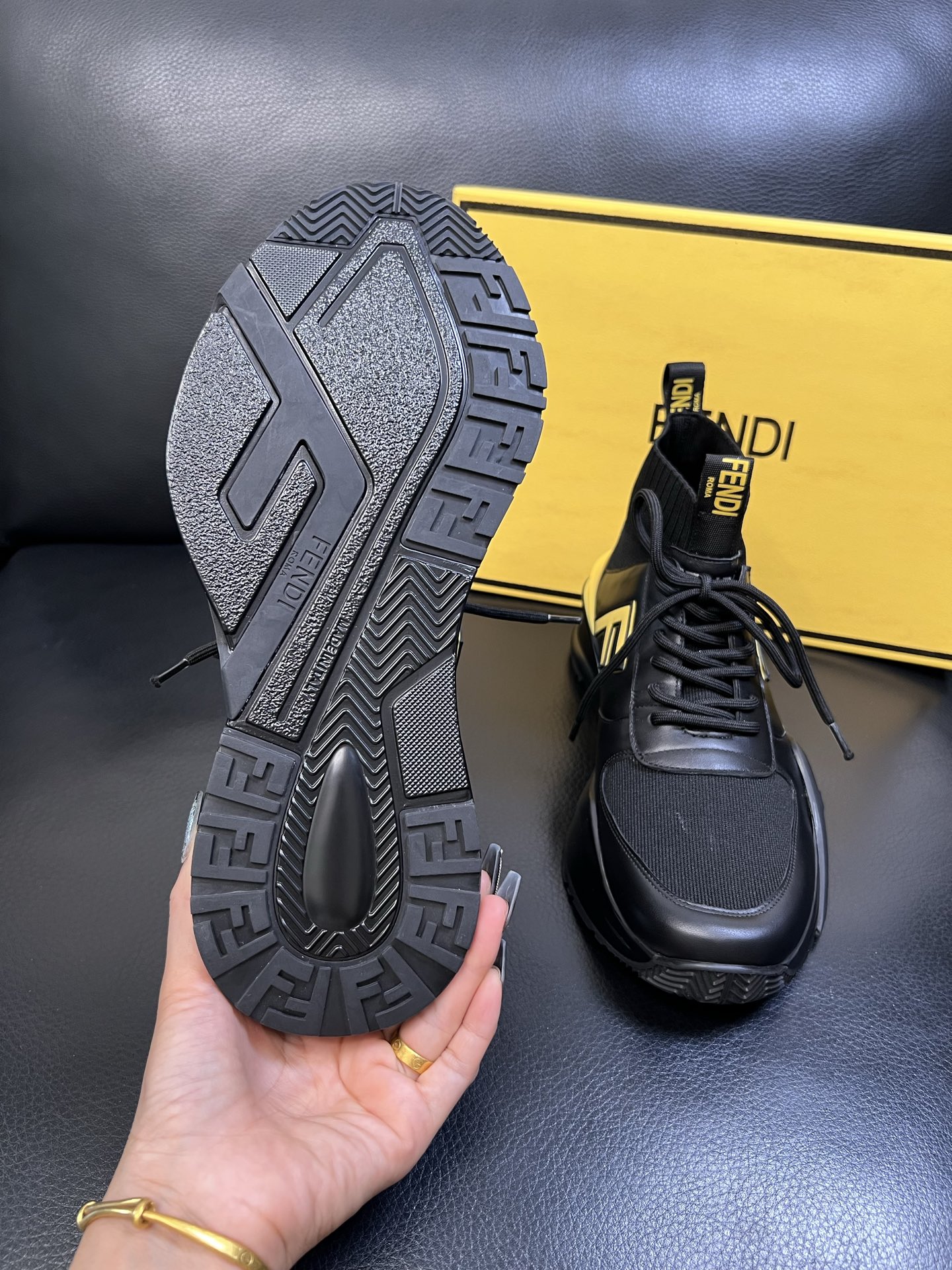 Step up your footwear game with these high-quality Fendi sneakers, featuring premium leather, knit fabric, and iconic Fendi design.