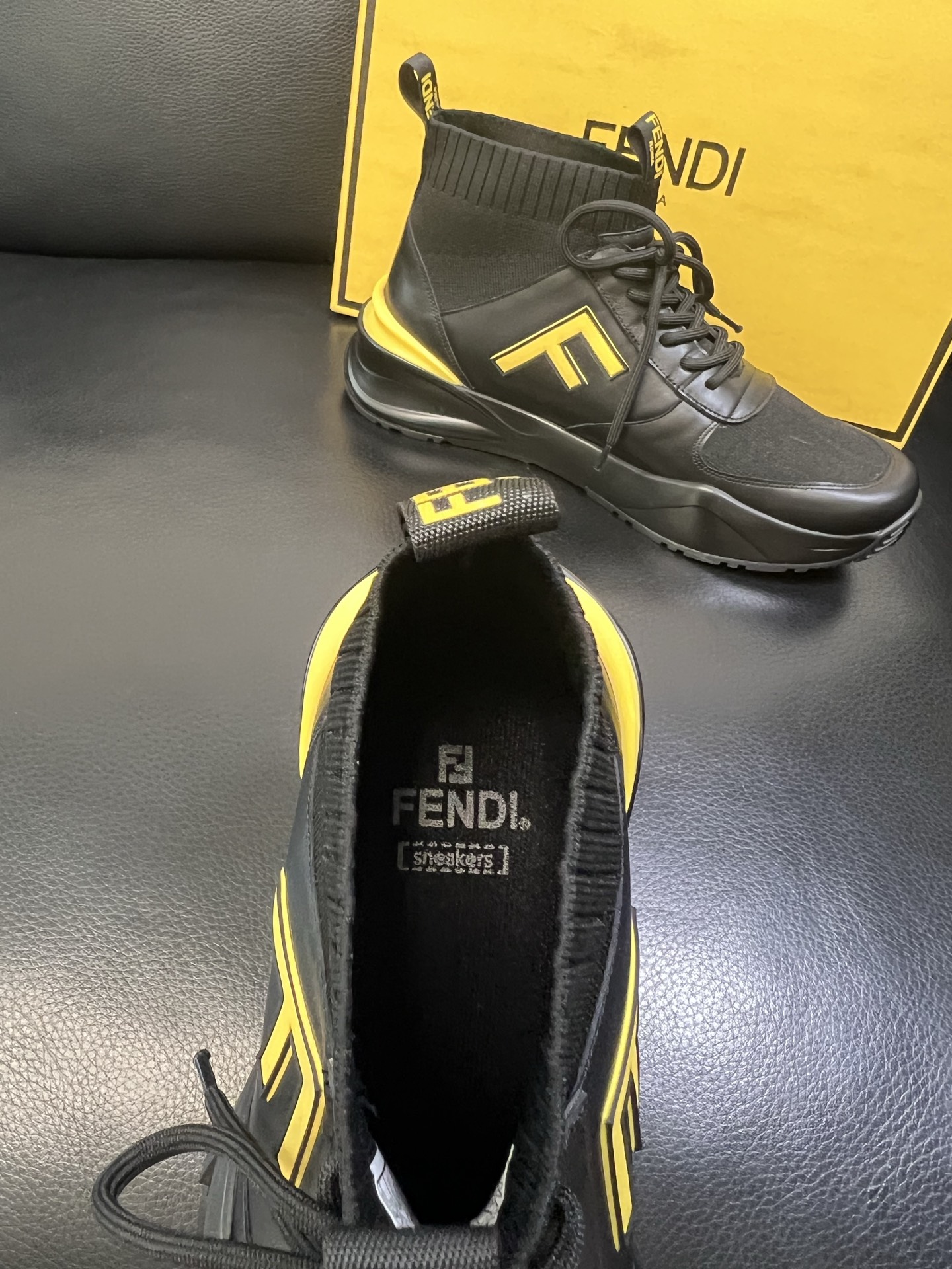 Fendi Men's Black Leather And Knit High-Top Sneakers Designer Athletic Shoes