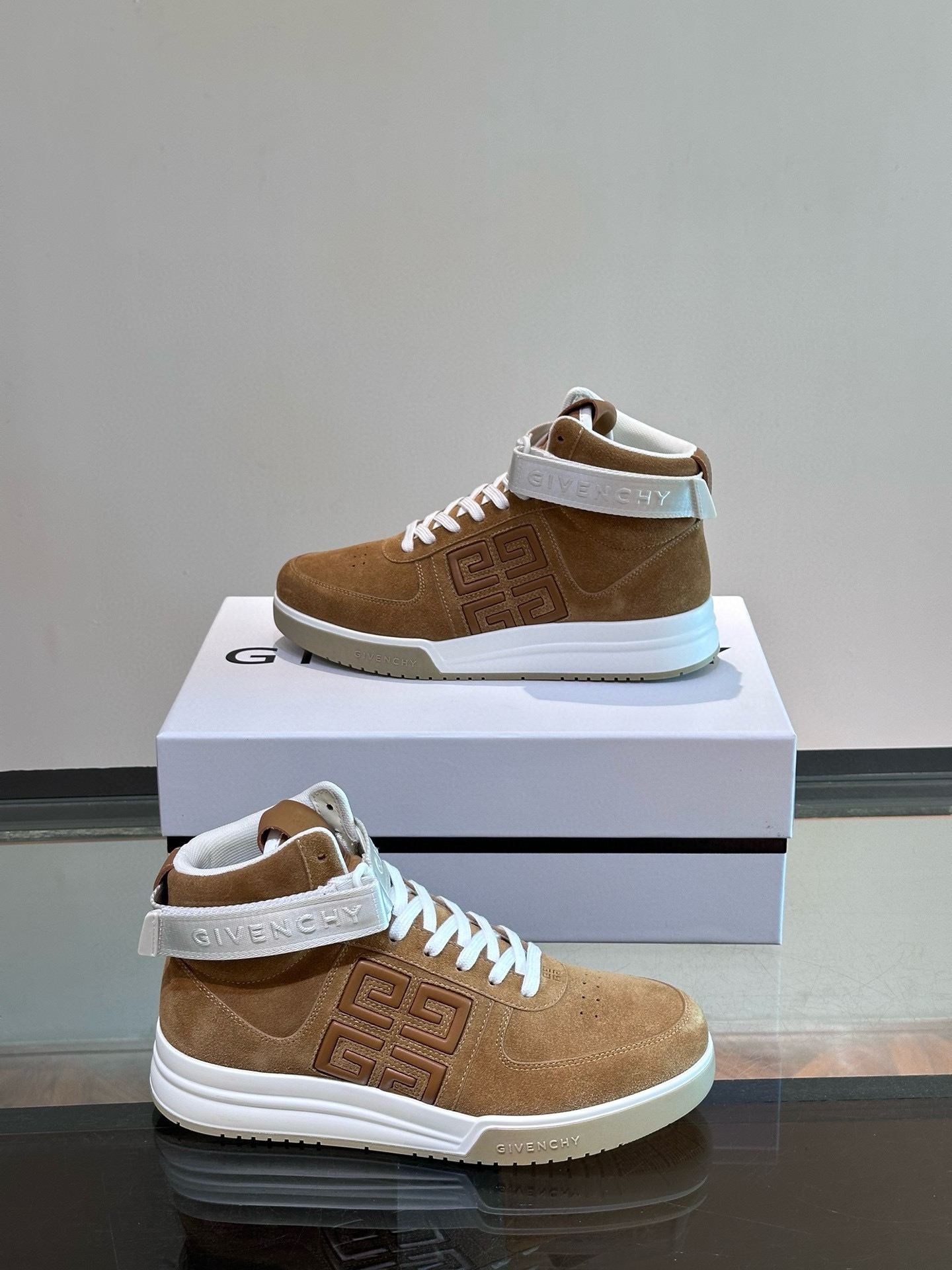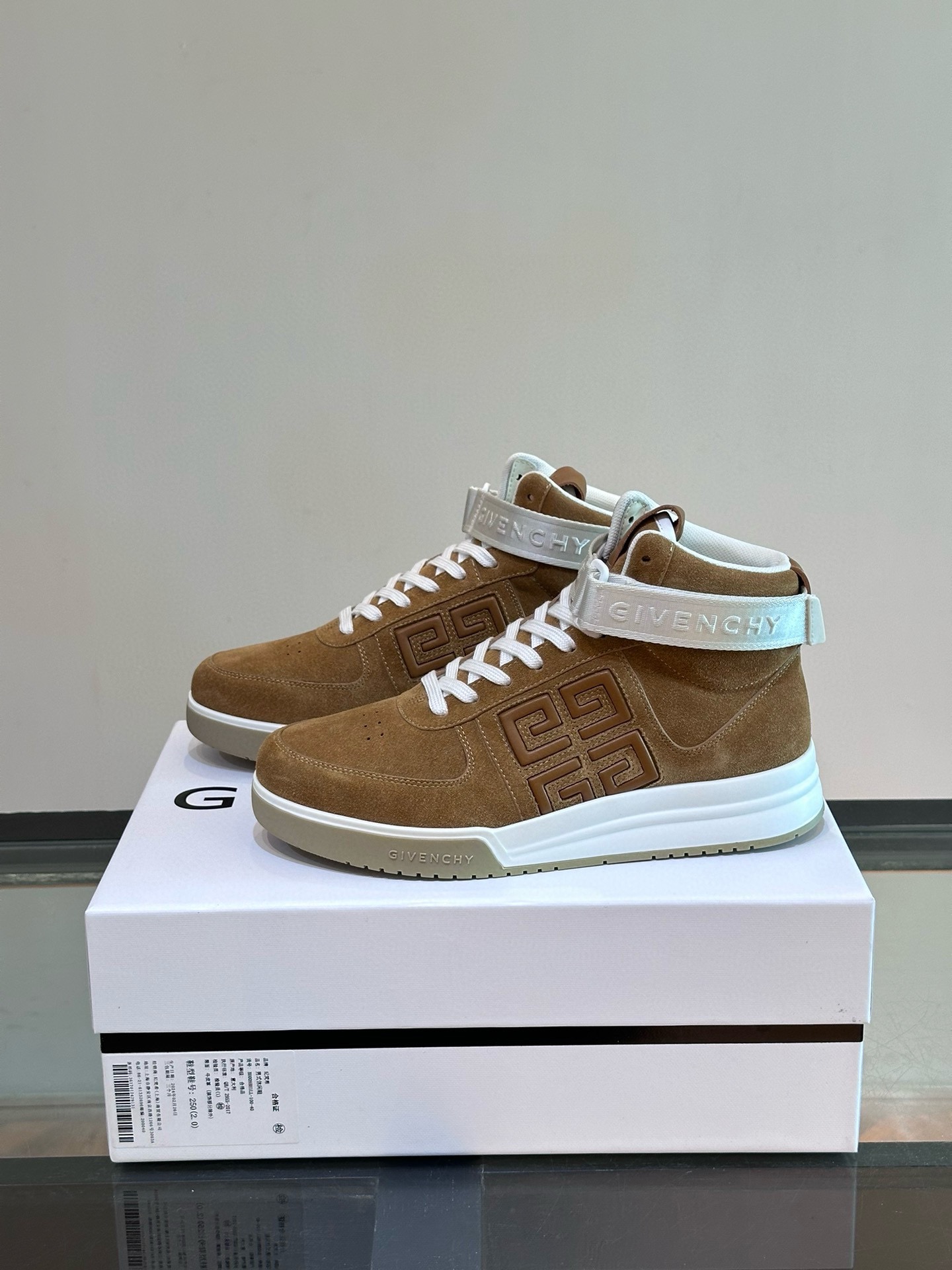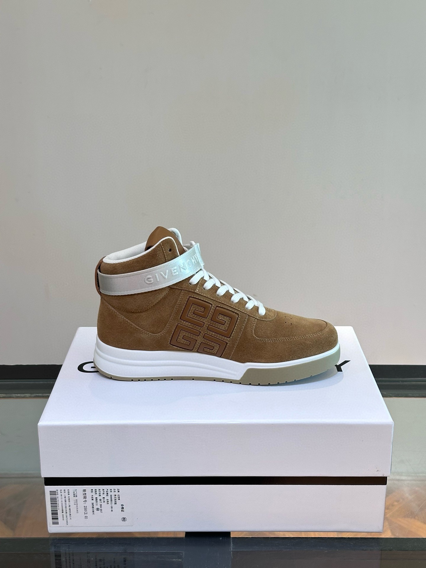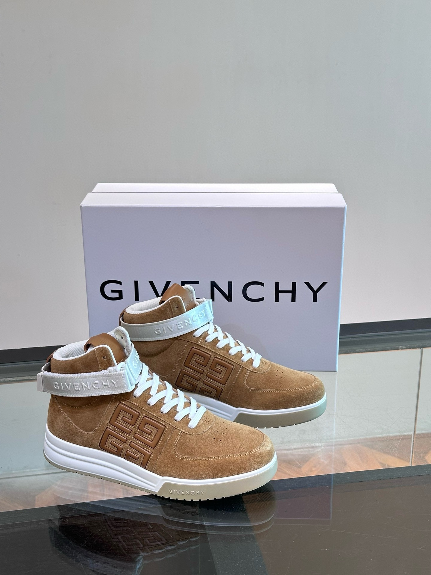 Elevate your style with these Givenchy high-top sneakers. Crafted from premium brown suede with a prominent 4G logo strap.