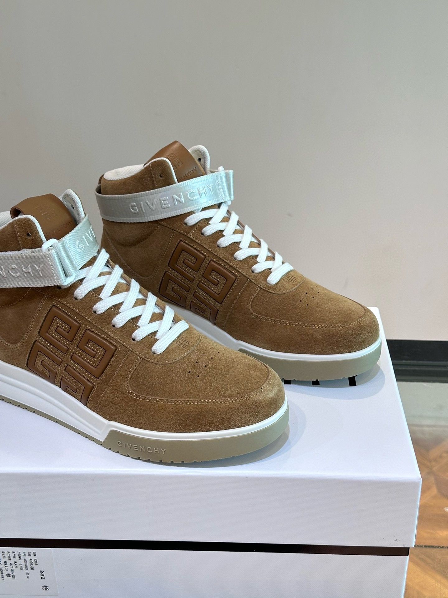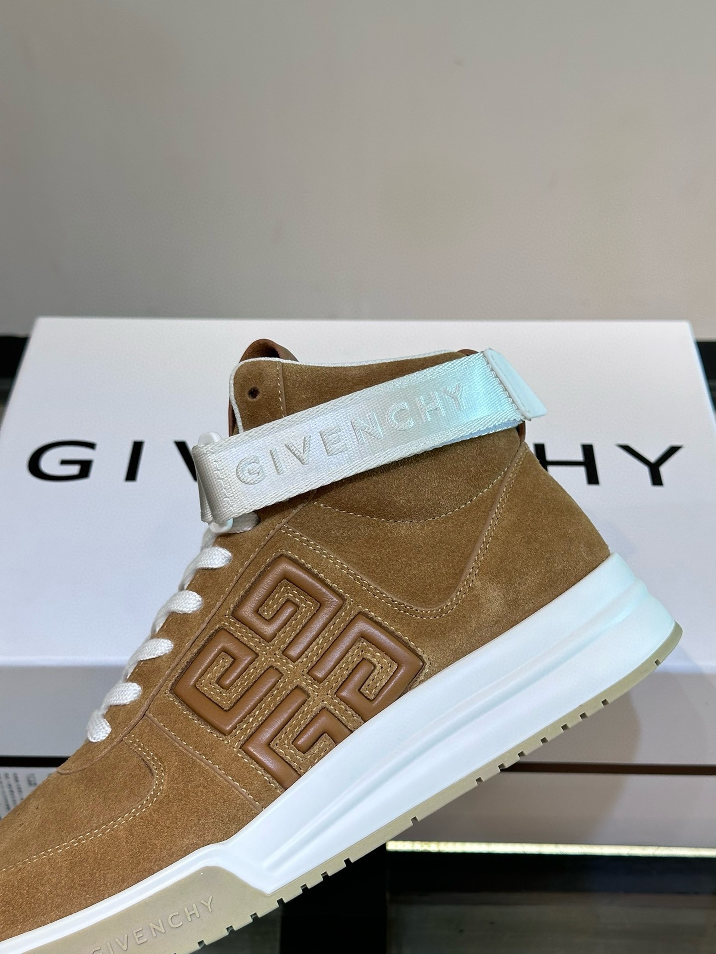 Tags: Brown Leather Sneakers, Designer Sneakers, Givenchy High-Top Sneakers, Logo Strap Shoes, Luxury Trainers, Suede High Tops