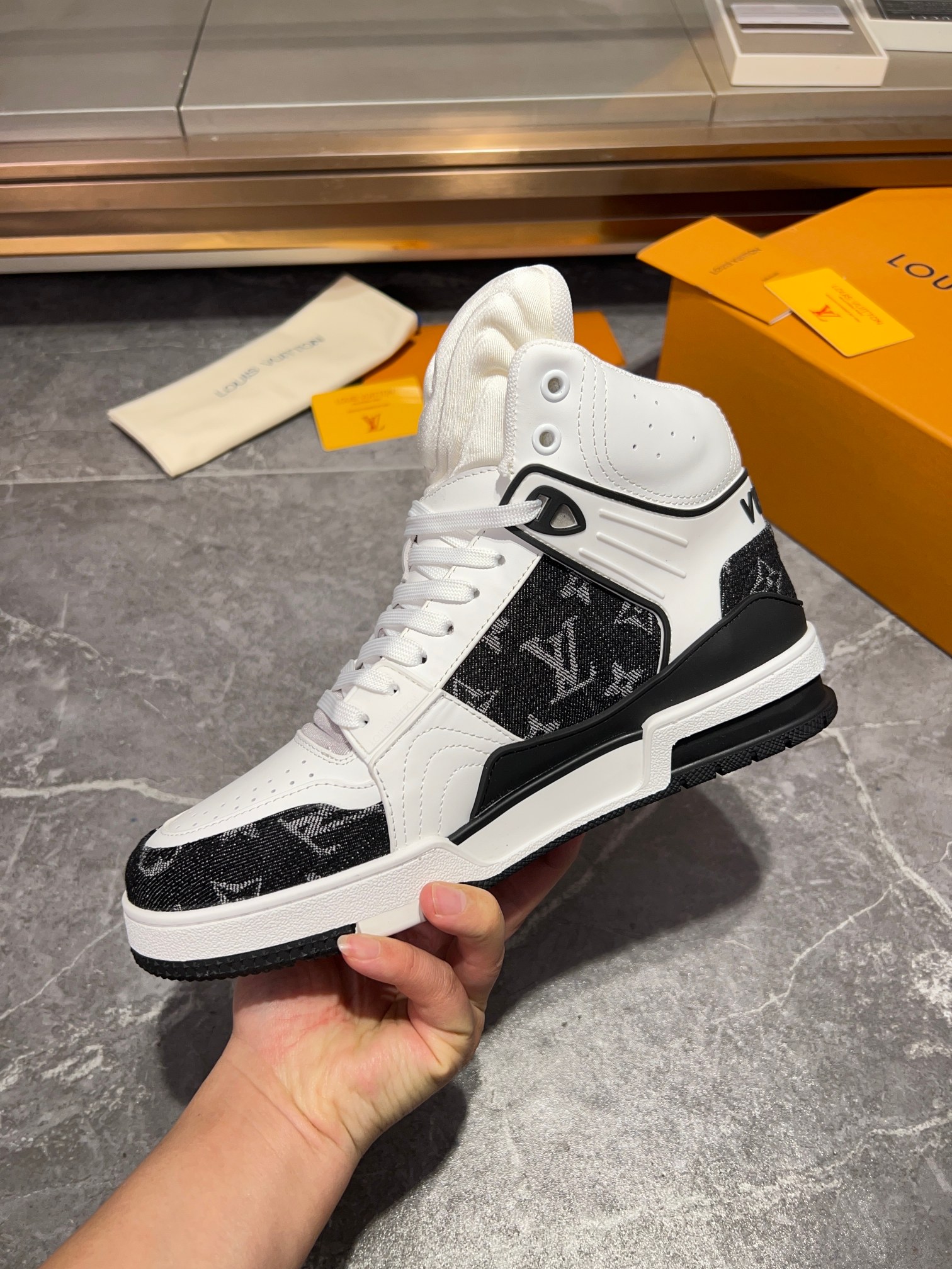 Introducing the epitome of luxury and style with these Louis Vuitton men's high-top sneakers. Crafted with meticulous attention to detail, these sneakers blend classic design with contemporary flair, making them a must-have addition to any discerning gentleman's wardrobe.