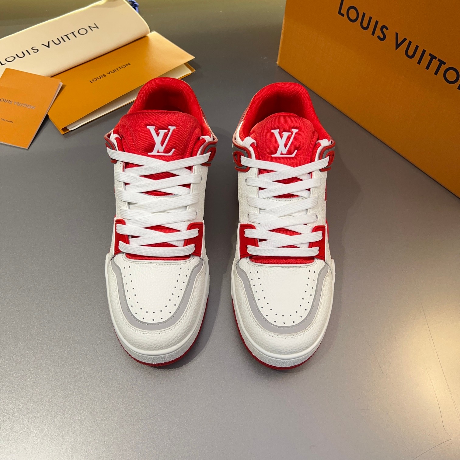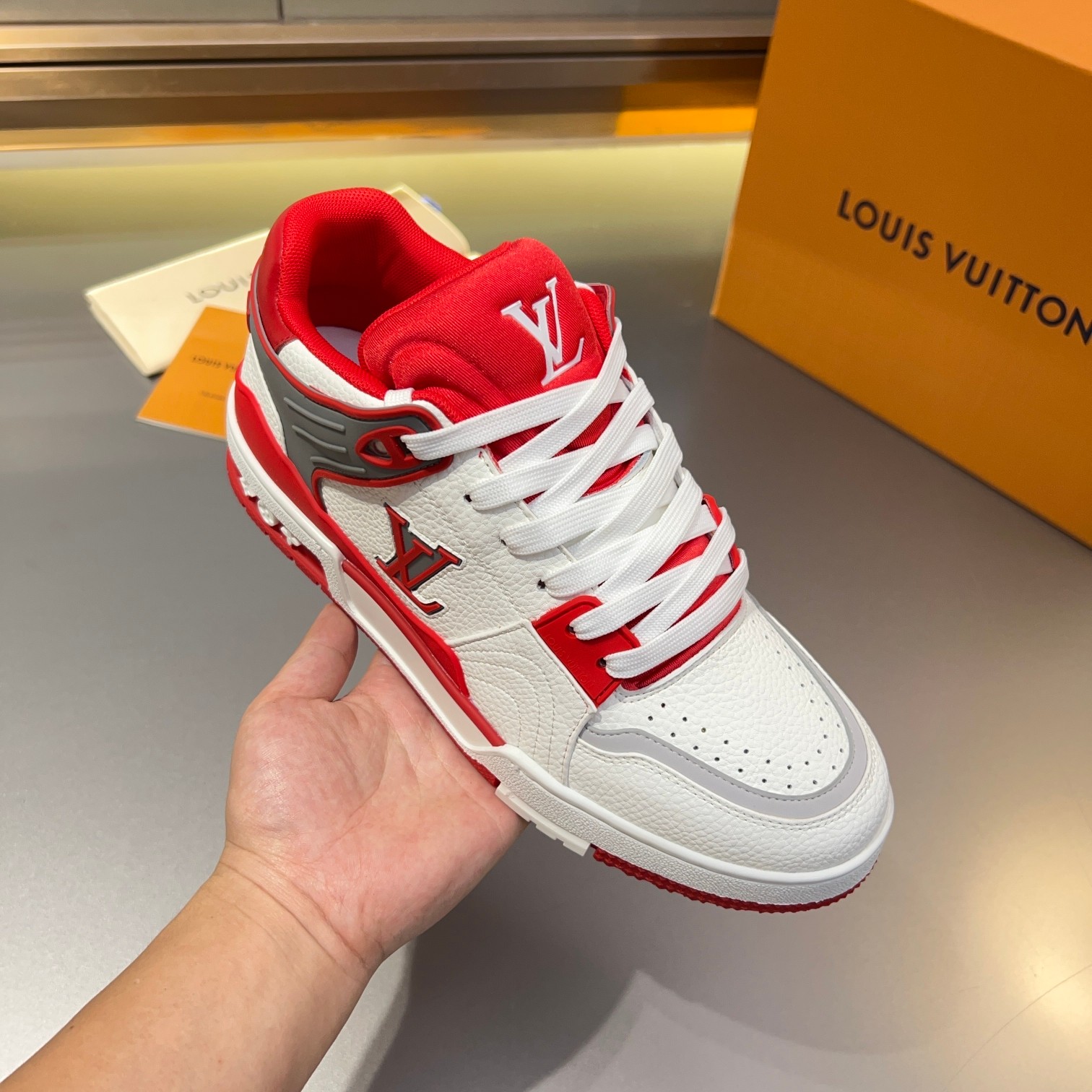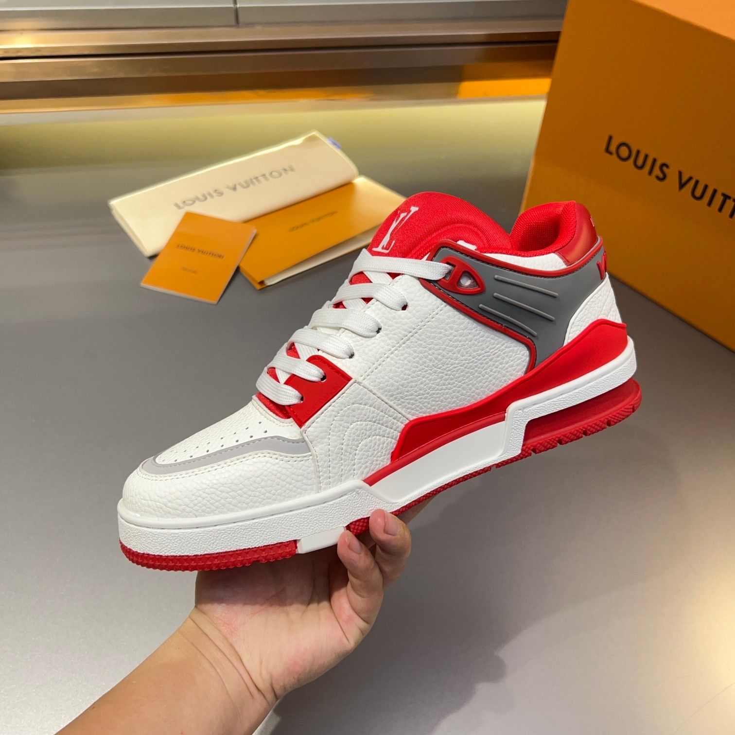Tags: Designer Leather Sneakers, Louis Vuitton Trainer Sneaker, Luxury Street Style Footwear, Monogrammed Fashion Shoes