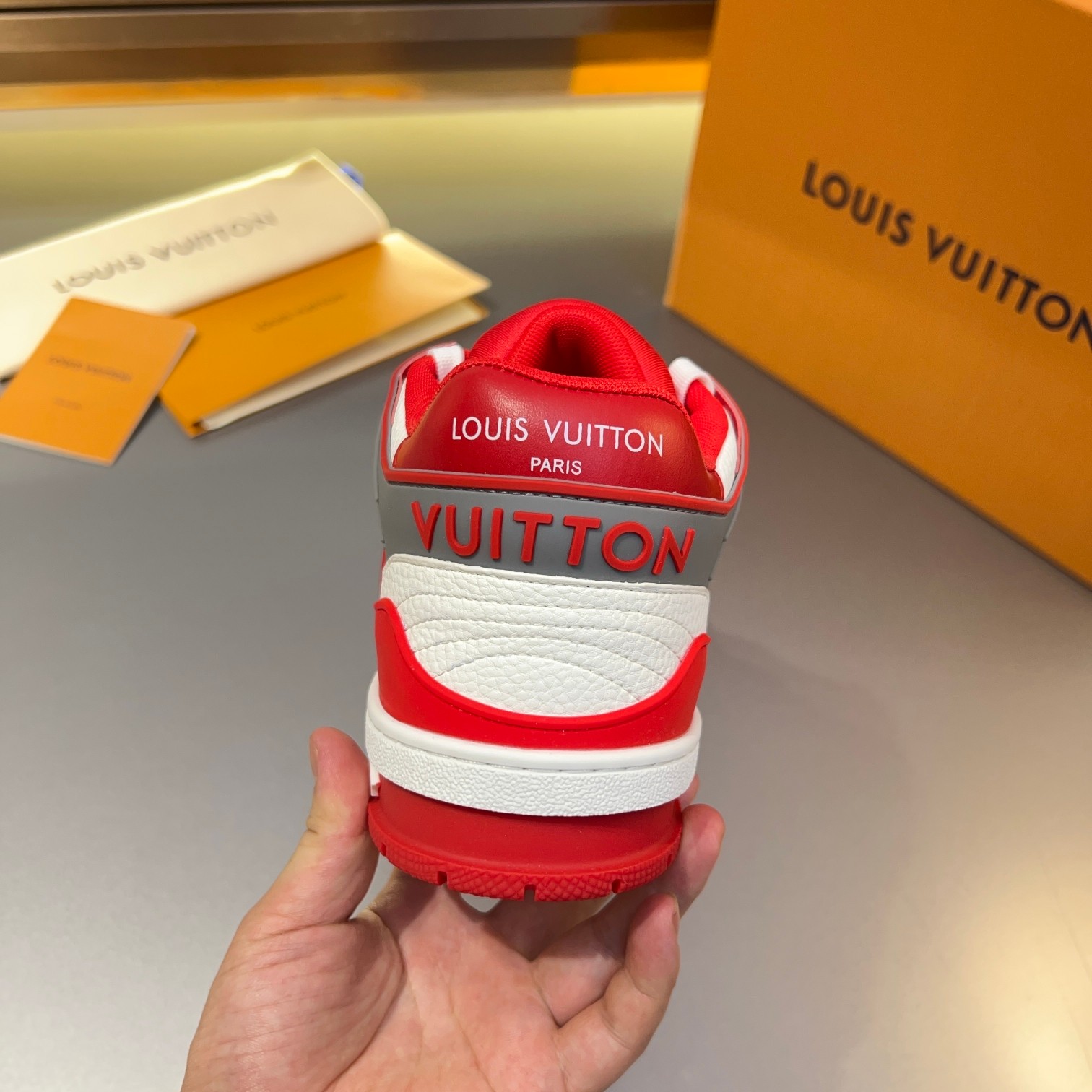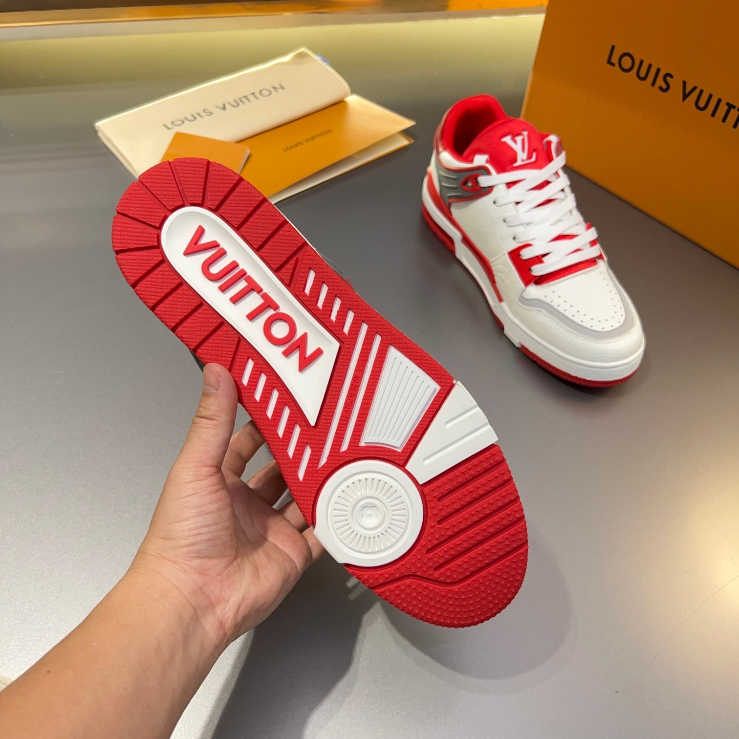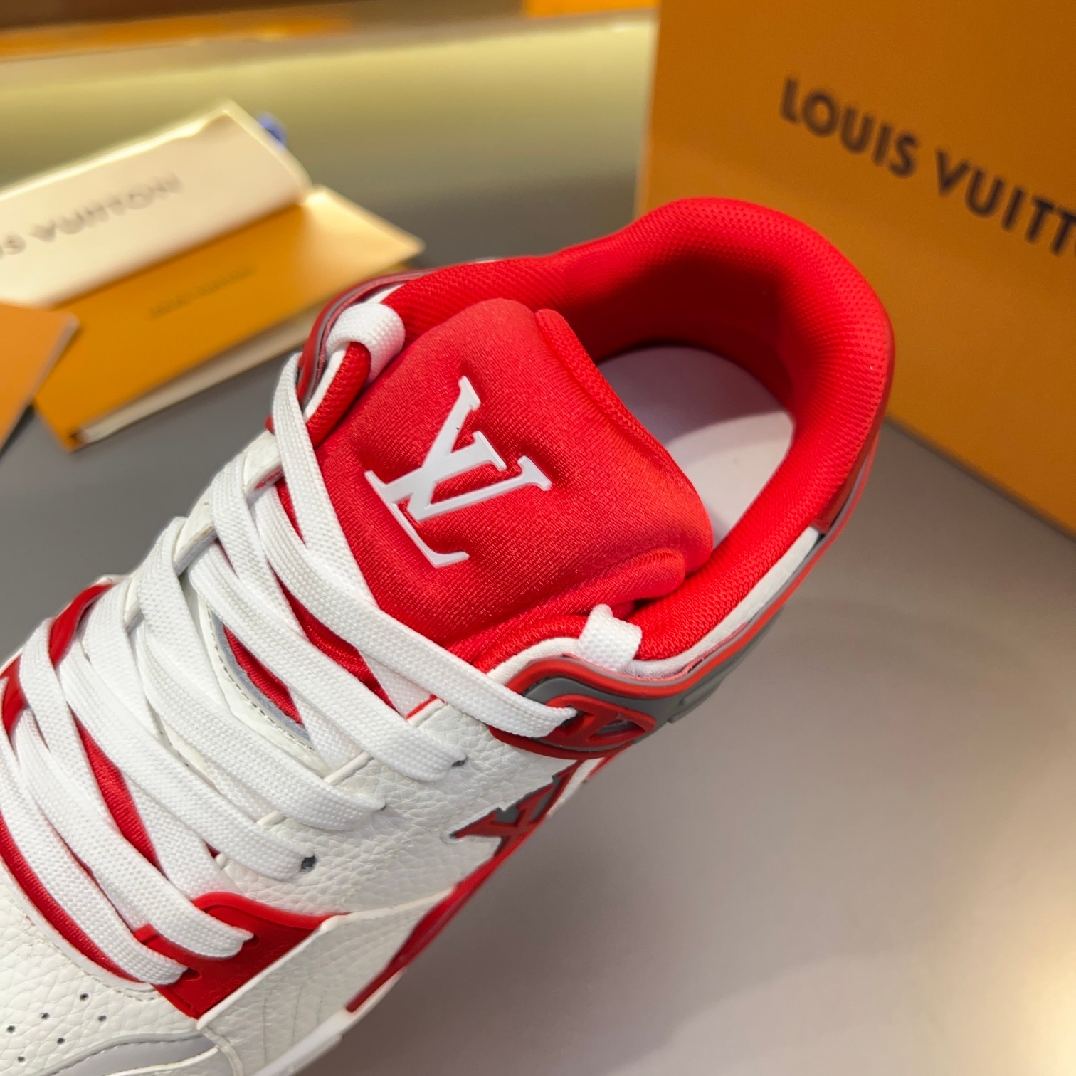 Tags: Designer Leather Sneakers, Louis Vuitton Trainer Sneaker, Luxury Street Style Footwear, Monogrammed Fashion Shoes